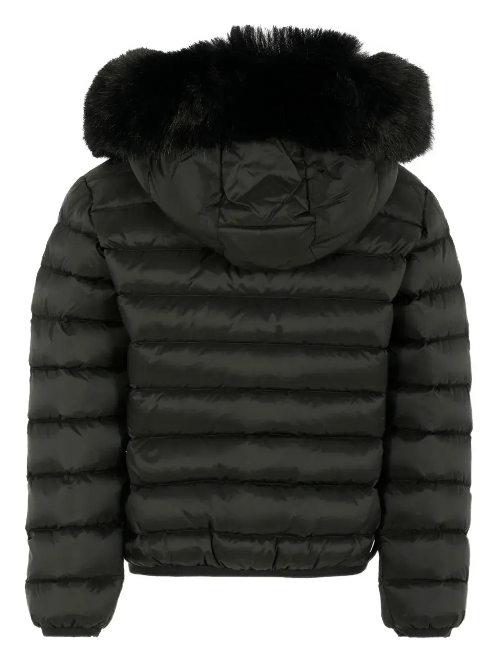 Черная куртка с горизонтальной стежкой, отделкой из искусственного меха на капюшоне, застежкой-молнией спереди, длинными рукавами и передними карманами на молнии