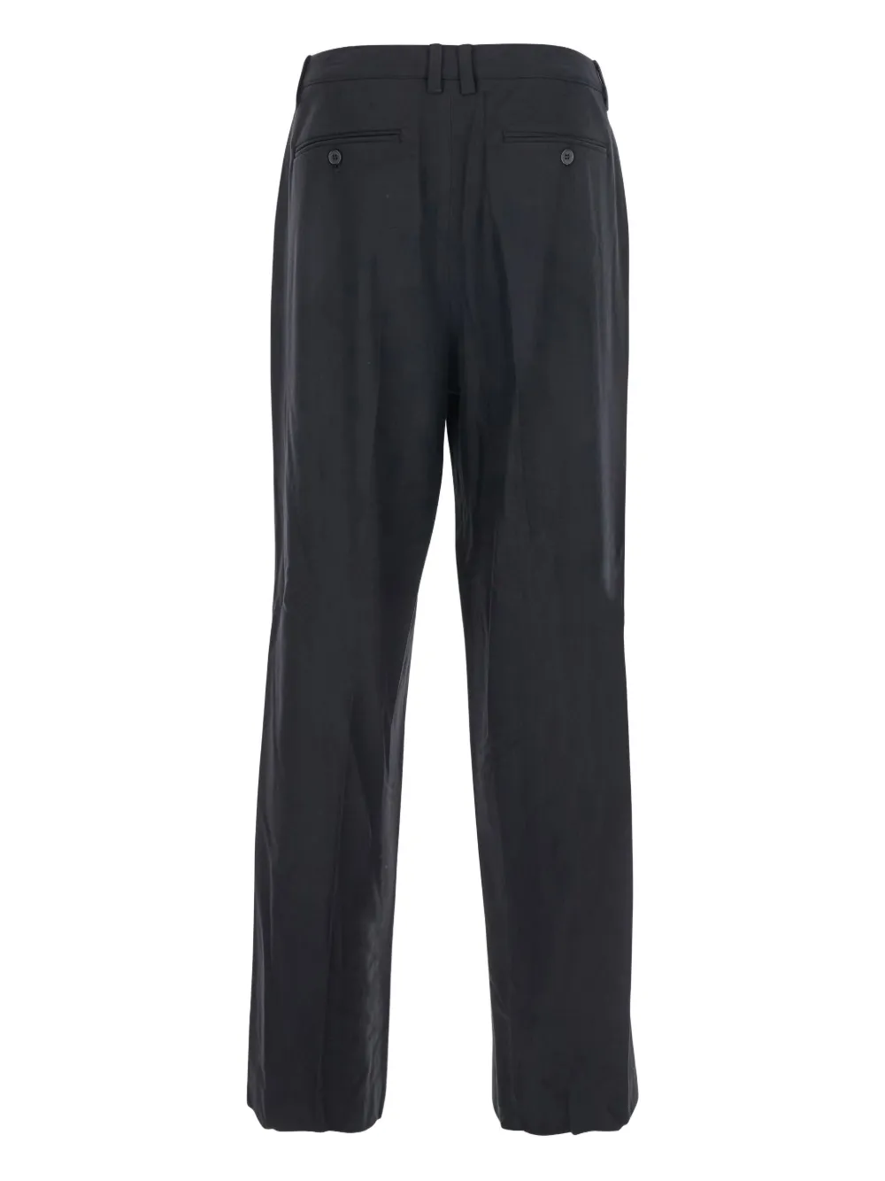 Черные, передние складки, застежка на пуговицах, боковые карманы, шлевки для ремня