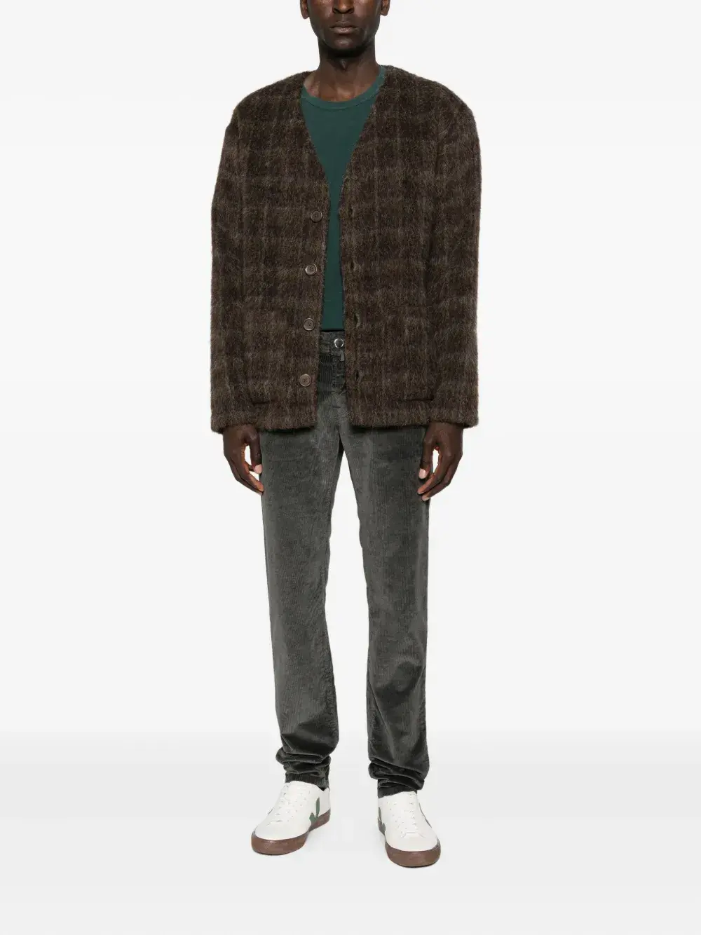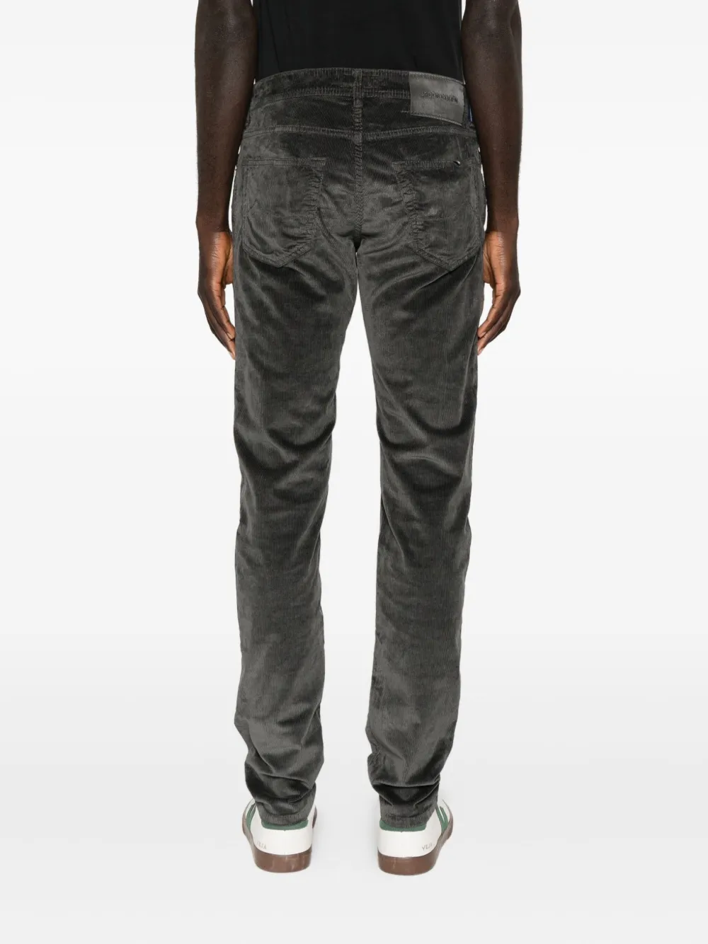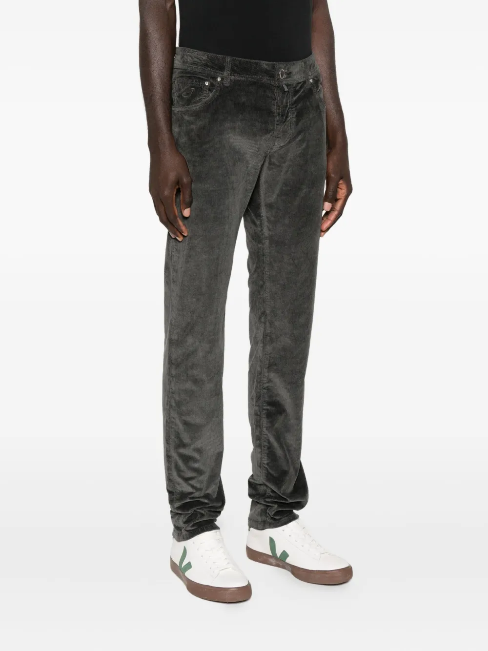 Пепельно-серый вельвет, текстура, пять карманов, шлевки для ремня, застежка на пуговицу, тональная строчка