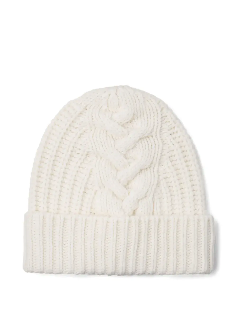 Белая вязаная шапка с косами, ребристым краем и декоративной нашивкой с логотипом
