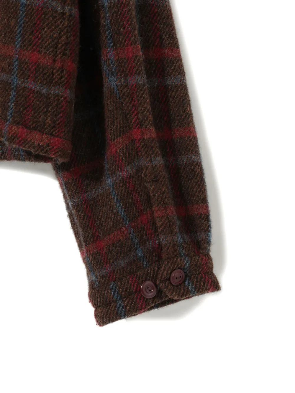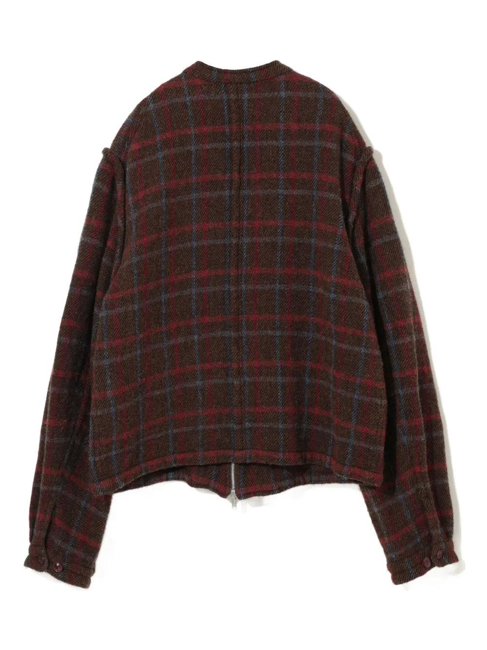 Коричневая куртка в клетку со стоячим воротником, застежкой-молнией спереди, прорезными карманами и манжетами на пуговицах