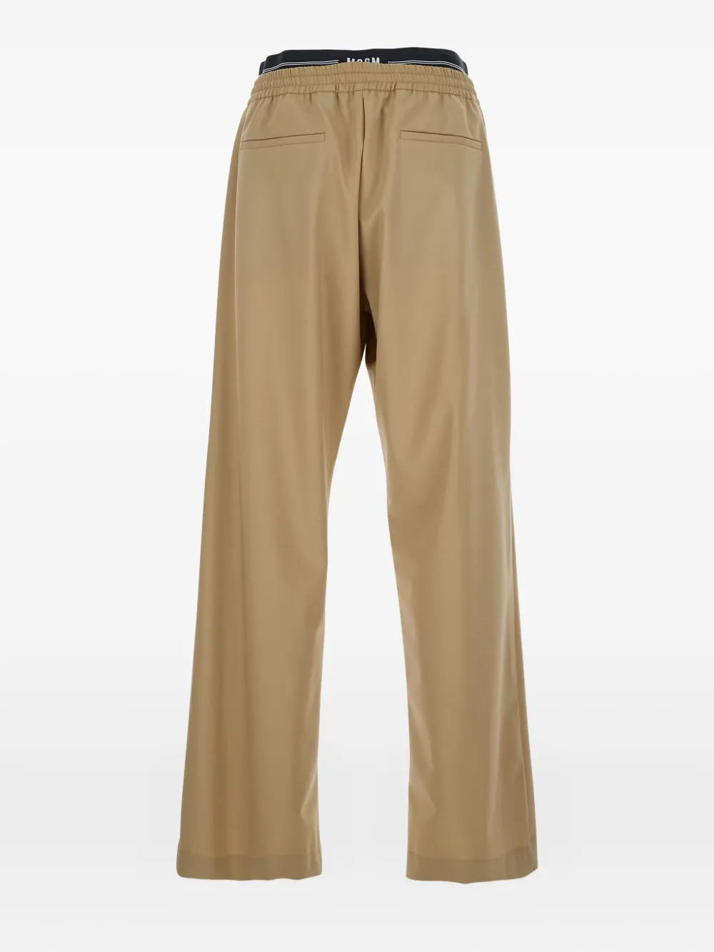 Бежевые брюки с эластичным поясом, шнурком для завязывания, логотипом, боковыми карманами и прямыми штанинами
