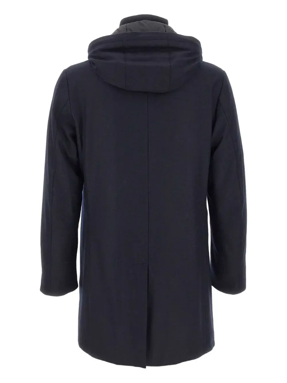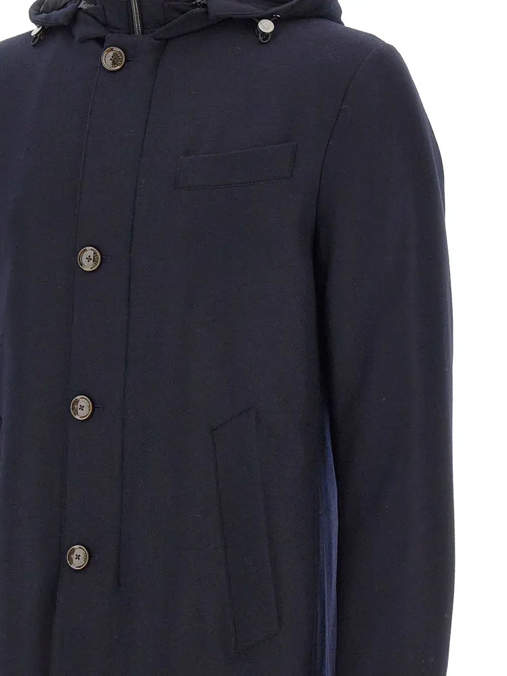 Темно-синий съемный капюшон застежка на пуговицы спереди боковые прорезные карманы нагрудный прорезной карман центральная шлица сзади