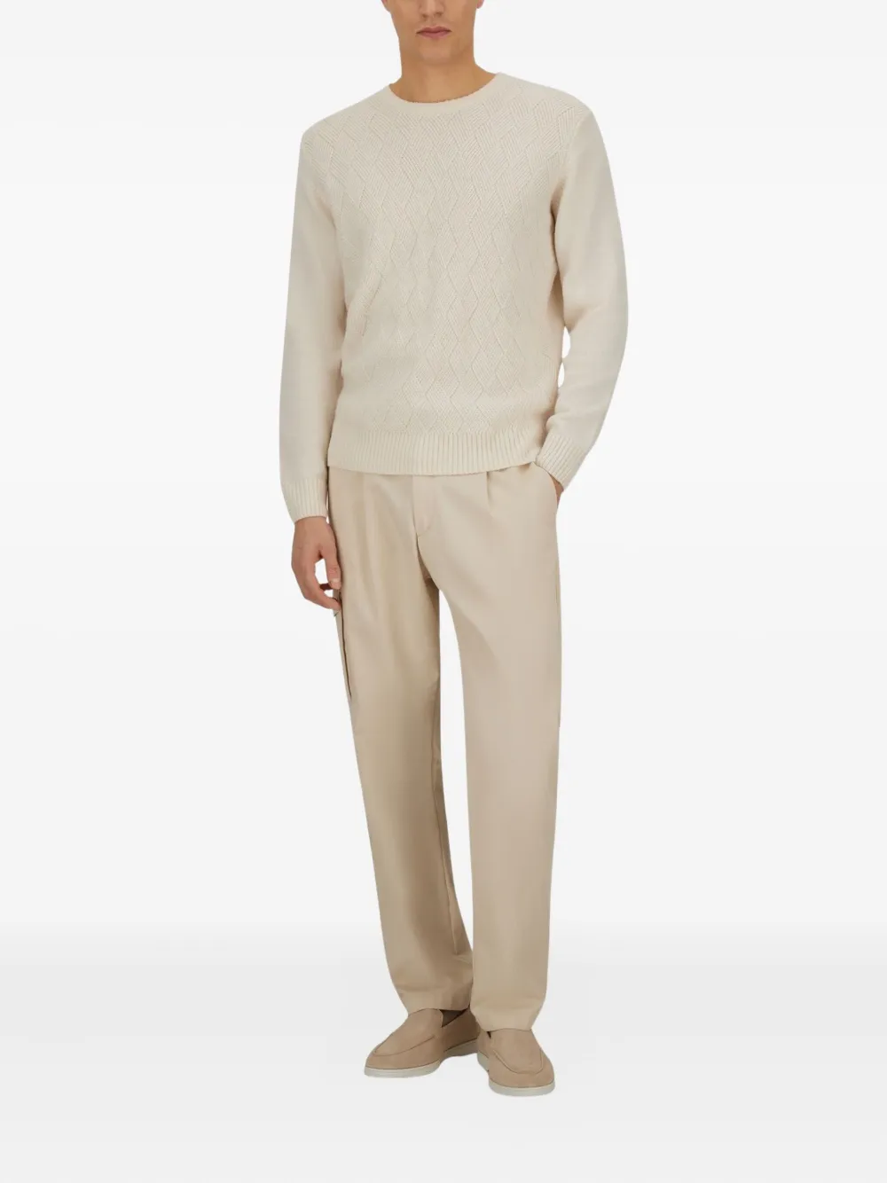 Белый ромбовидный узор круглый вырез длинные рукава вязаный жгутами смесь кашемира и шерсти