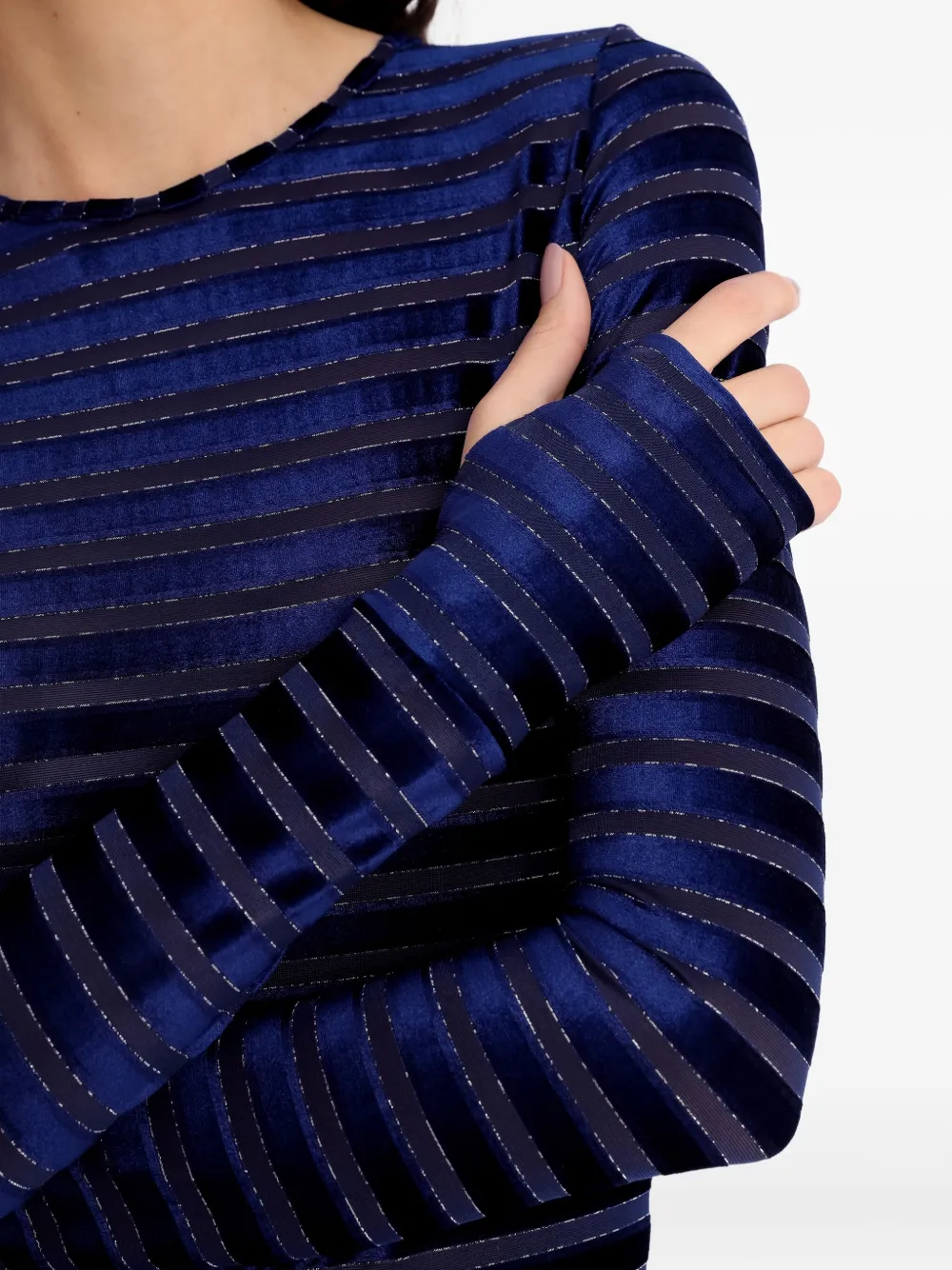 Синий с горизонтальным полосатым узором, длинные рукава, круглый вырез