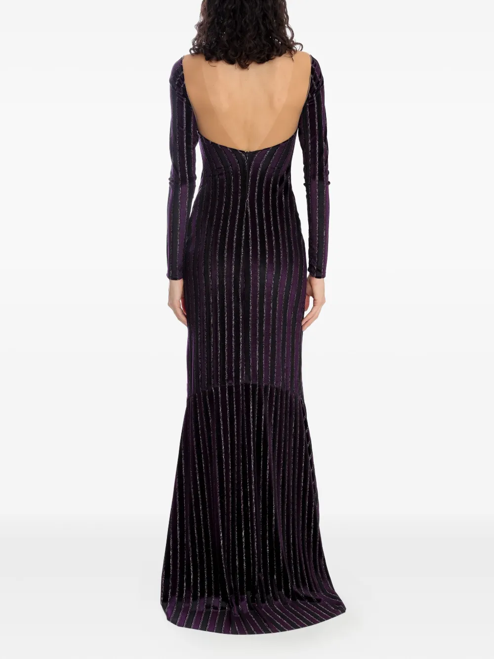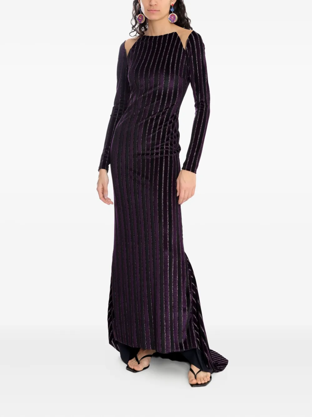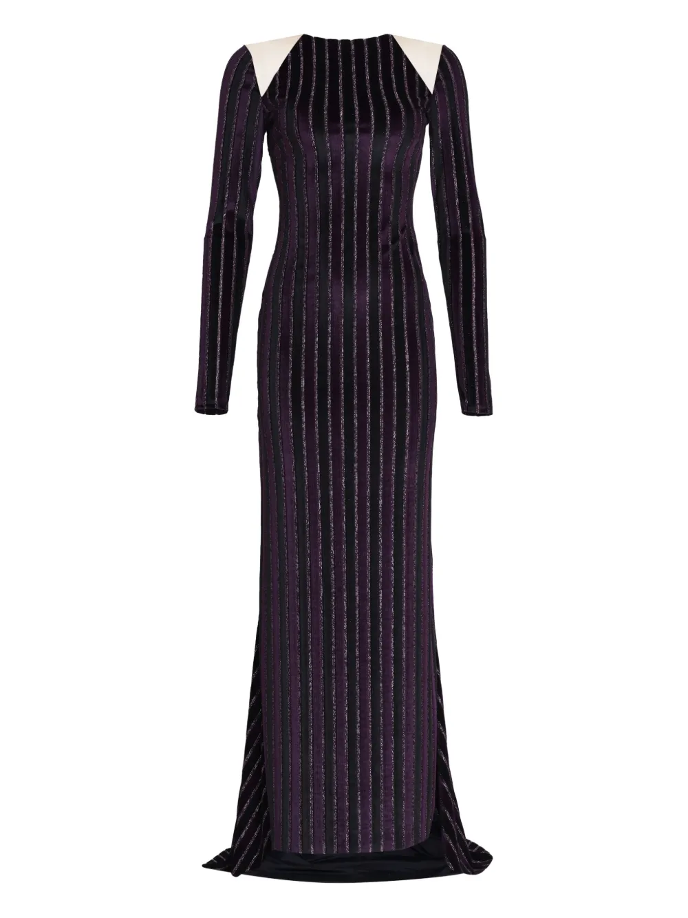 Фиолетовые вертикальные полосы, вставки из сетки, длинные рукава, небольшой шлейф, круглый вырез