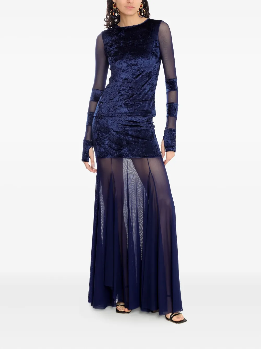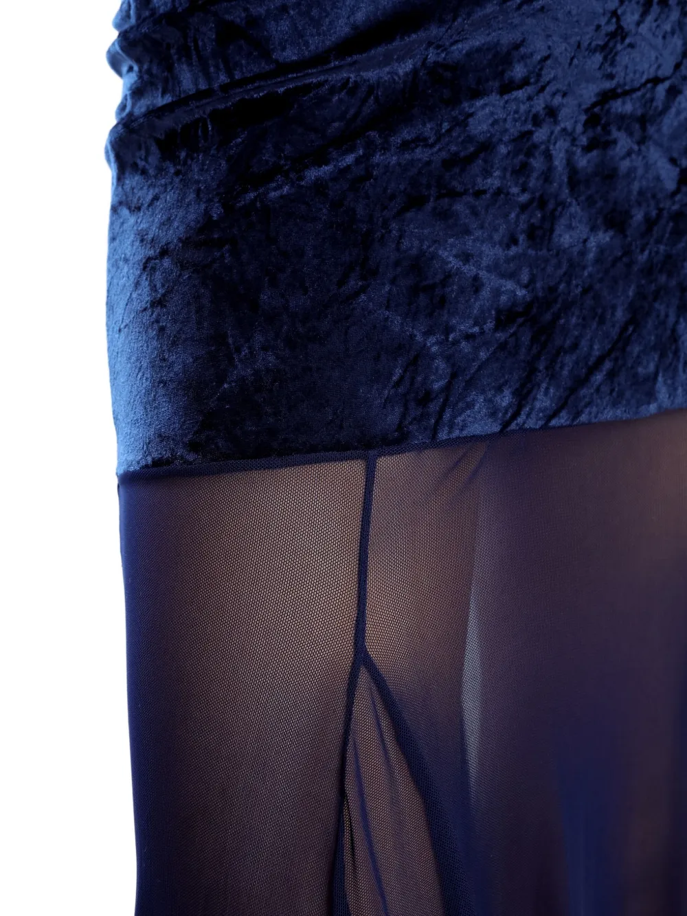 Темно-синий бархат, вставки из сетки, детали с драпировкой, завышенная талия
