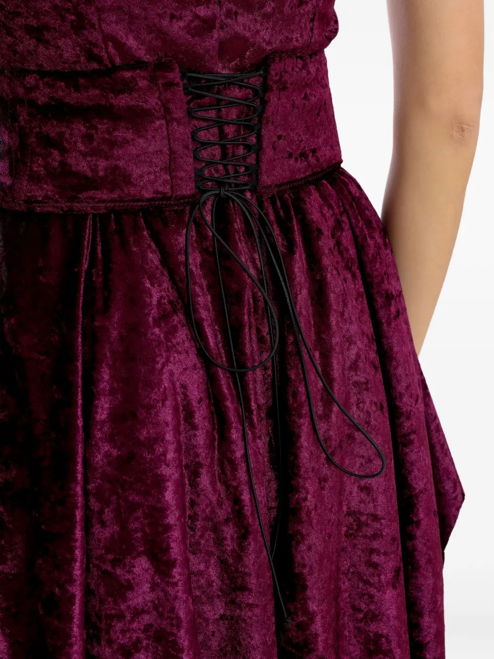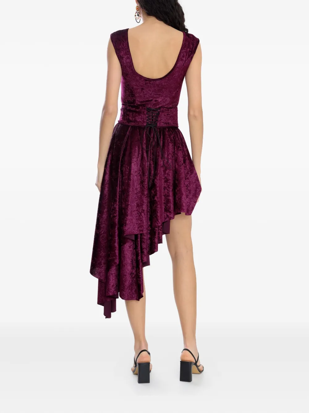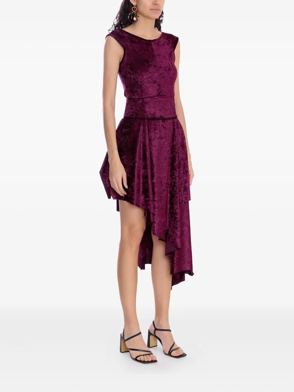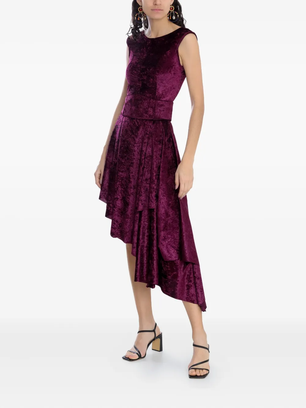 Бордовое бархатное платье без рукавов с круглым вырезом, поясом на талии и асимметричным подолом