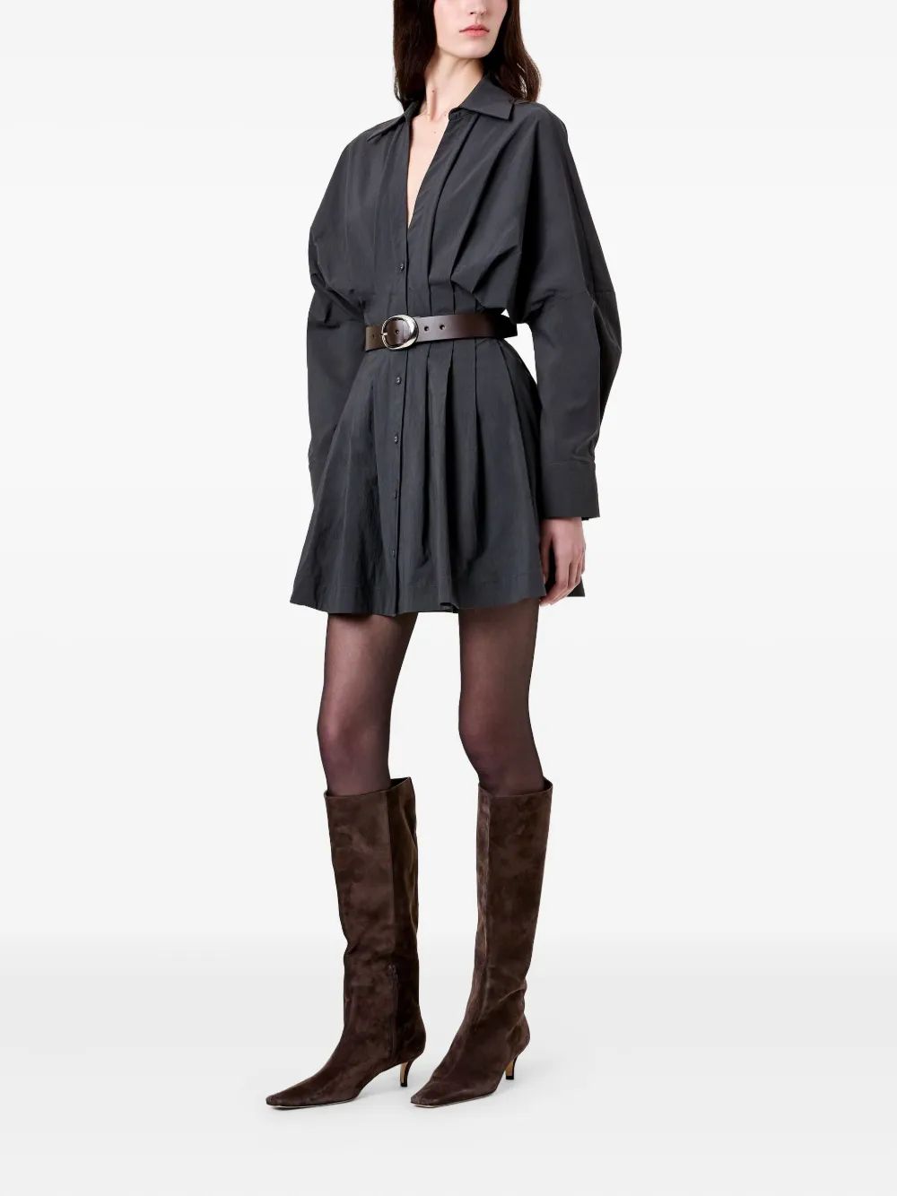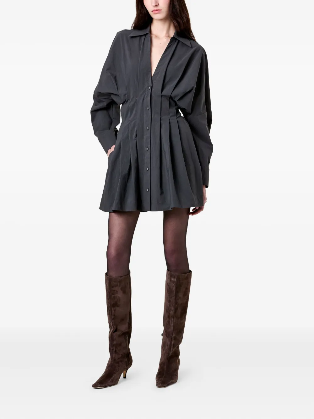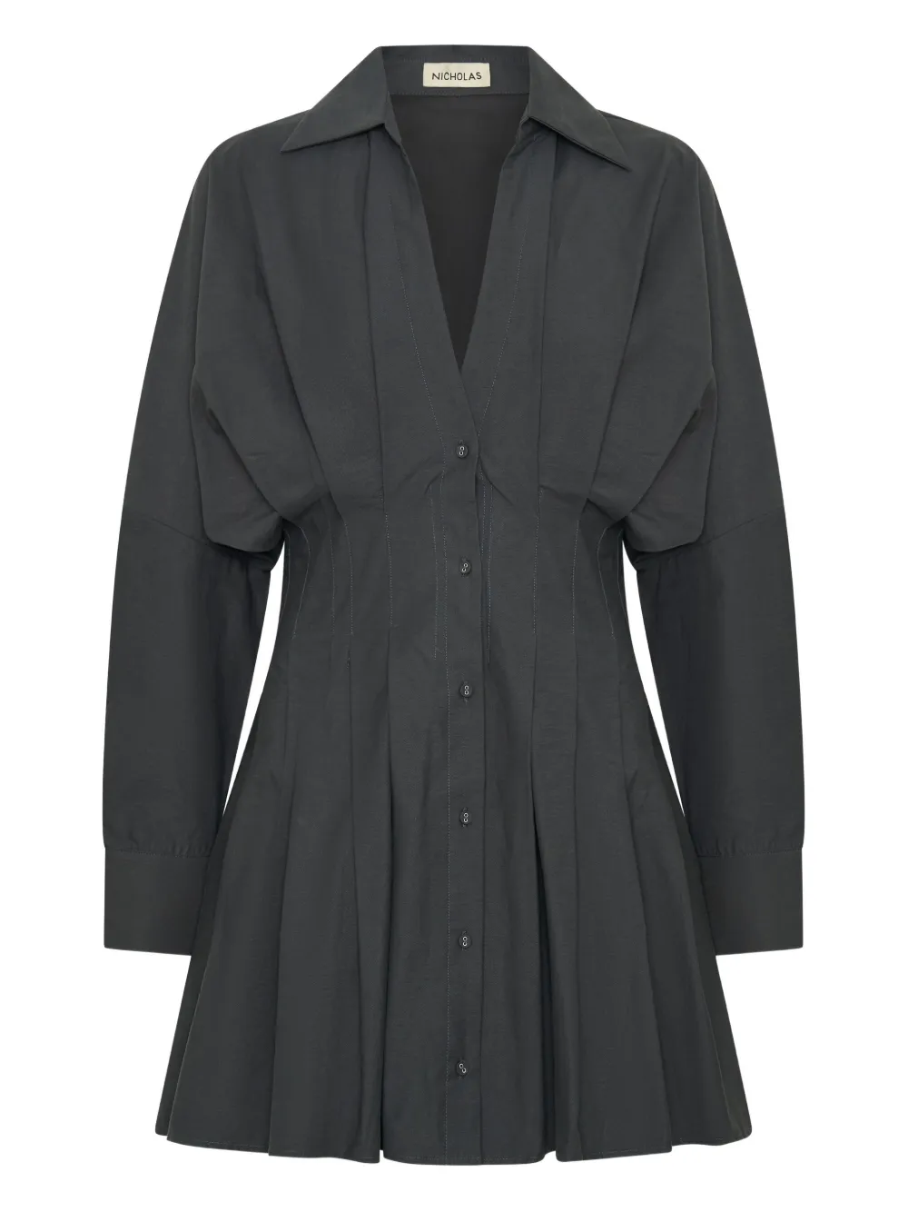 Угольно-серое платье с V-образным вырезом, застежкой на пуговицы, длинными рукавами и плиссированной юбкой