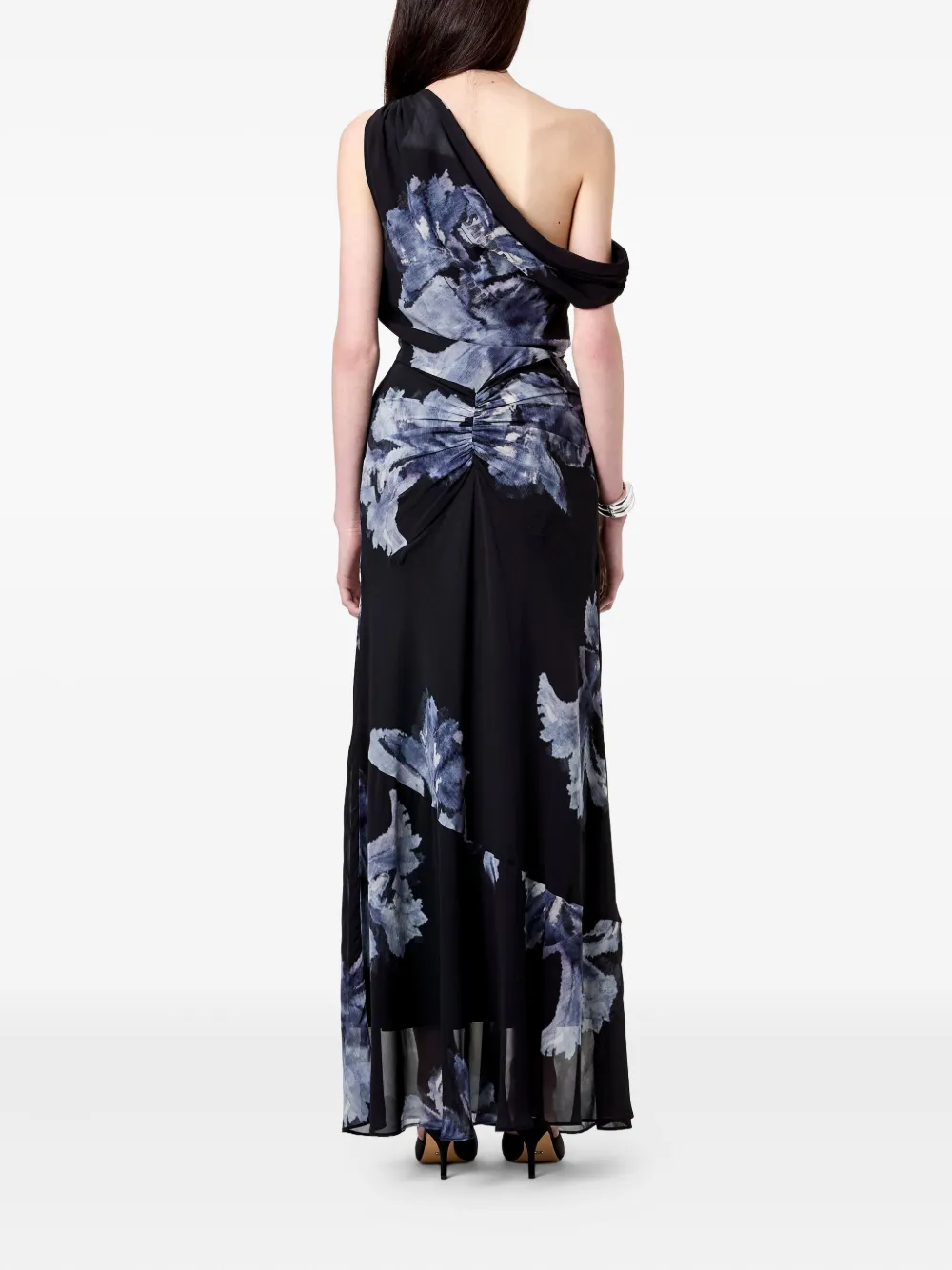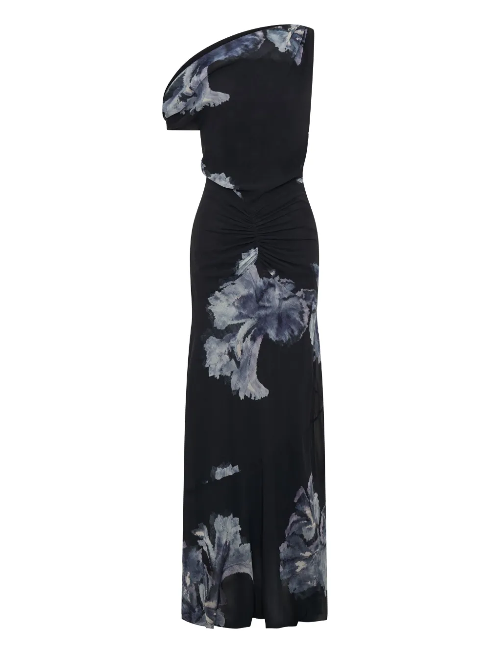 Темно-синее платье с цветочным принтом, асимметричным одним открытым плечом и сборками