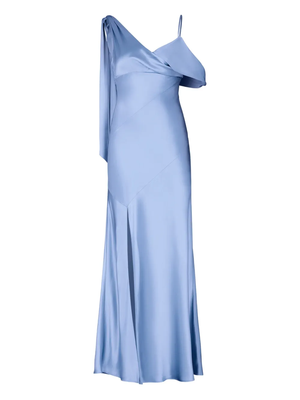 Небесно-голубое платье на одно плечо с тонкой бретелькой, разрезом сбоку и драпировкой