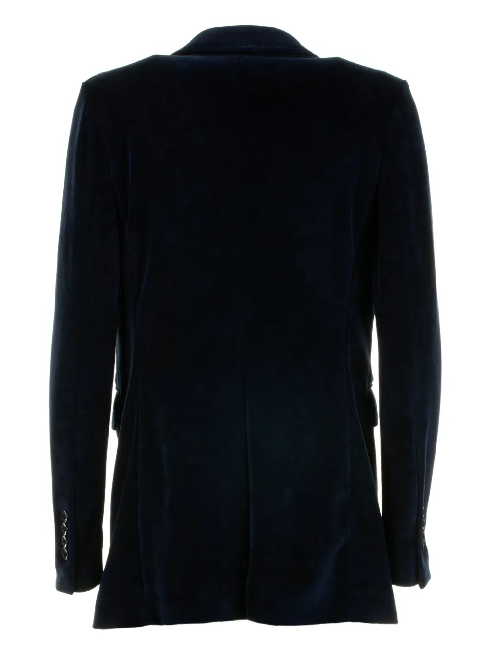 Синий бархат, текстура, застежка на пуговицы, лацканы с вырезом, передние клапанные карманы, манжеты на пуговицах