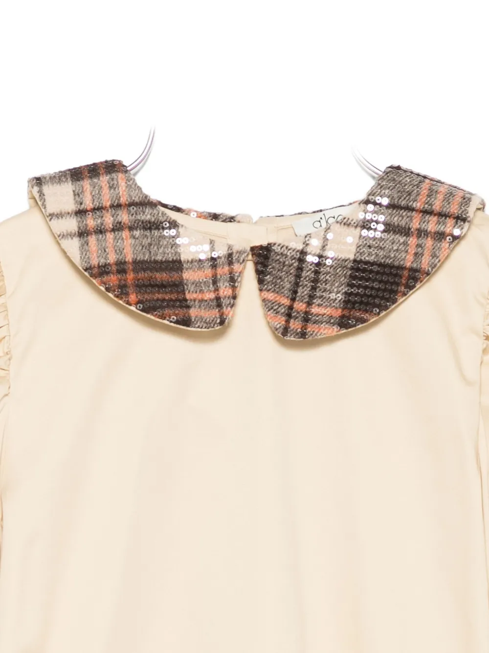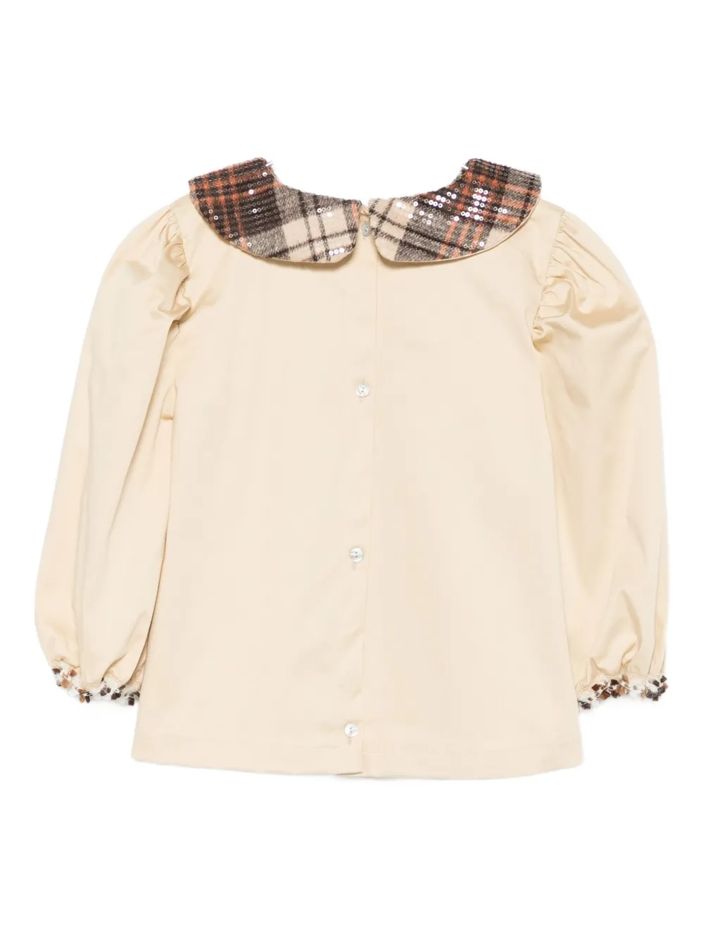 Бежевый клетчатый узор отделка пайетками круглый воротник длинные рукава застежка на пуговицы