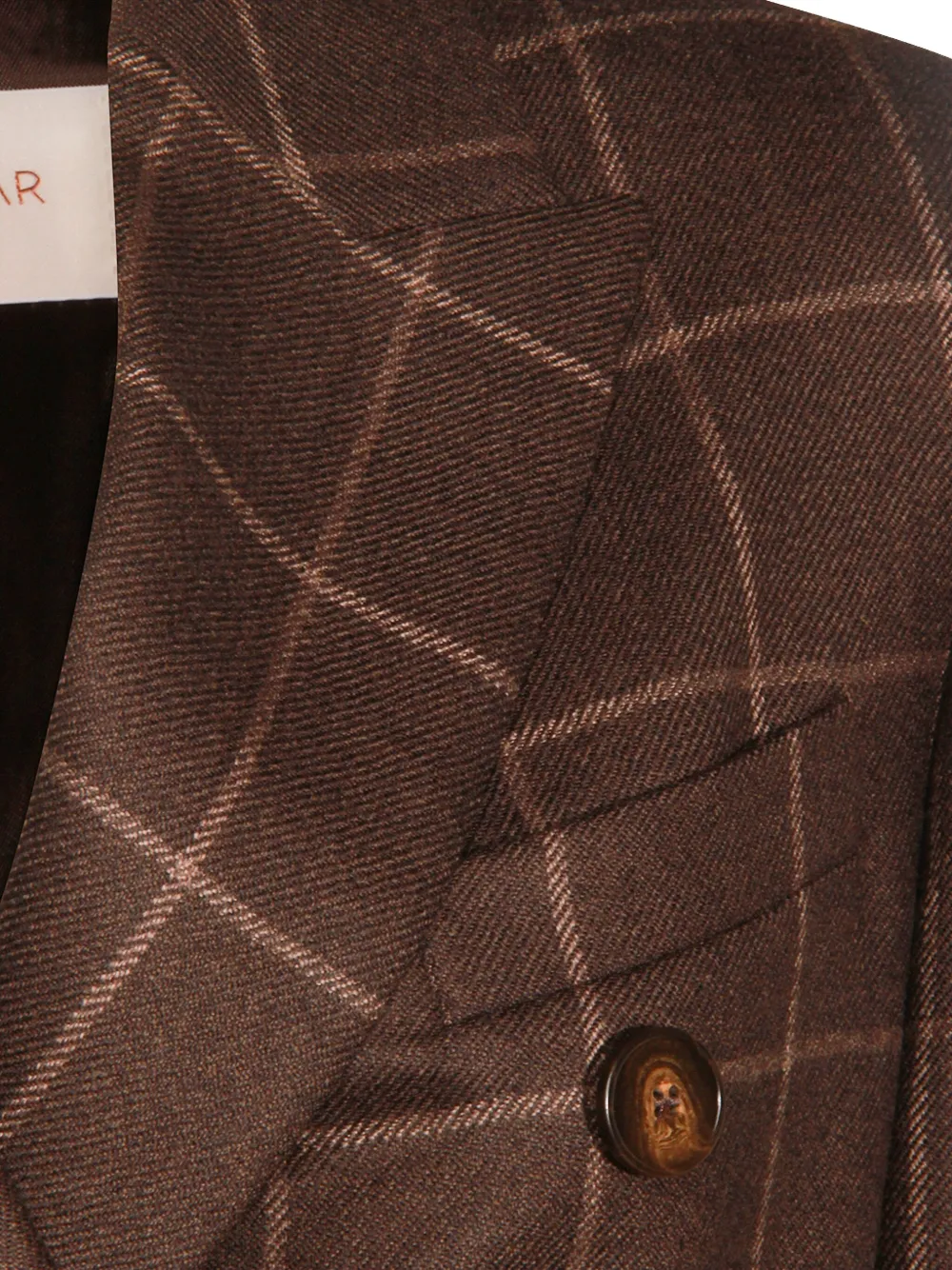 Коричневый жакет в клетку, двубортная застежка на пуговицы, лацканы с острыми концами, боковые карманы