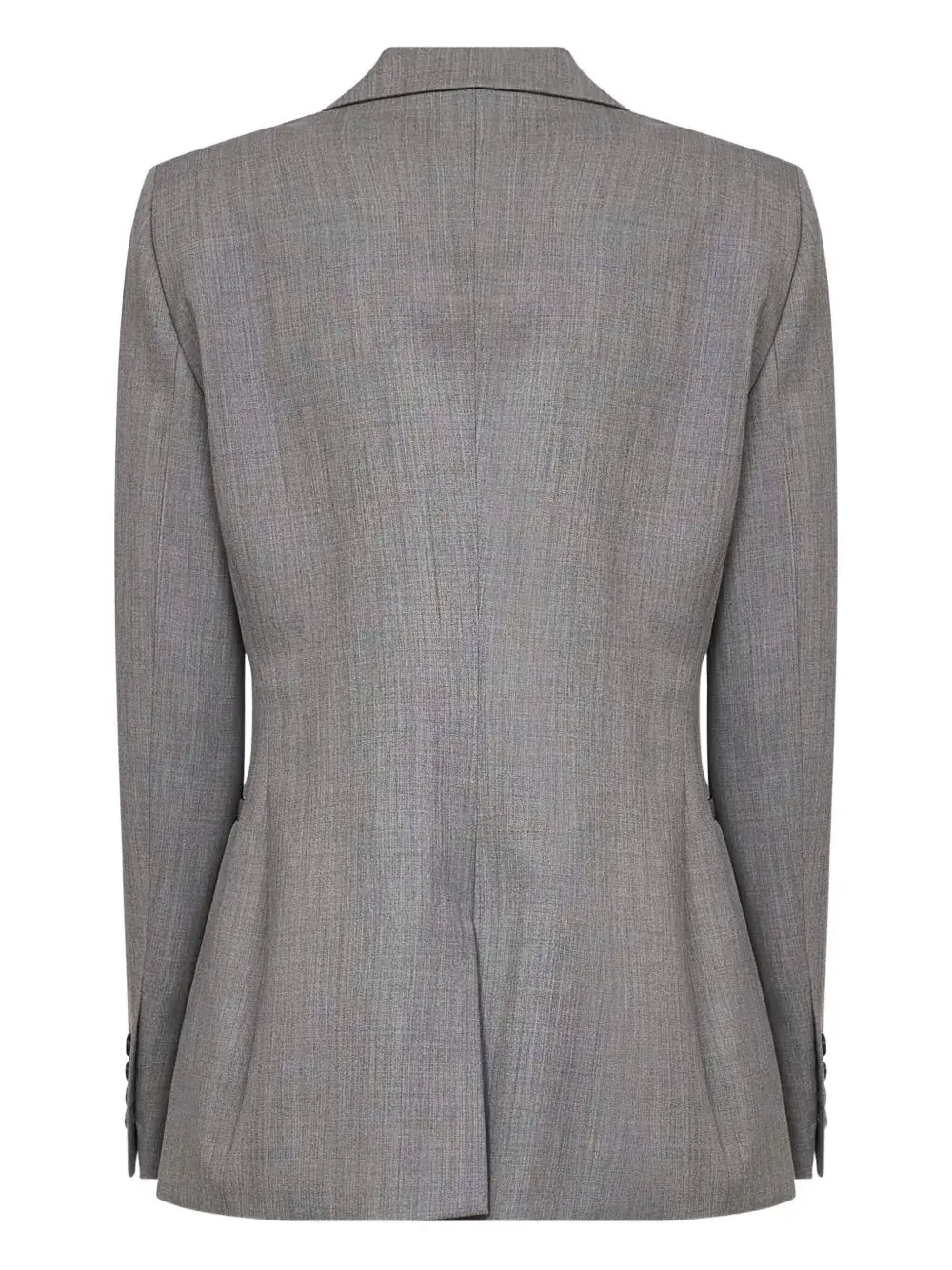 Серый двубортный пиджак с застежкой на пуговицы, лацканами с острыми концами, длинными рукавами и боковыми карманами