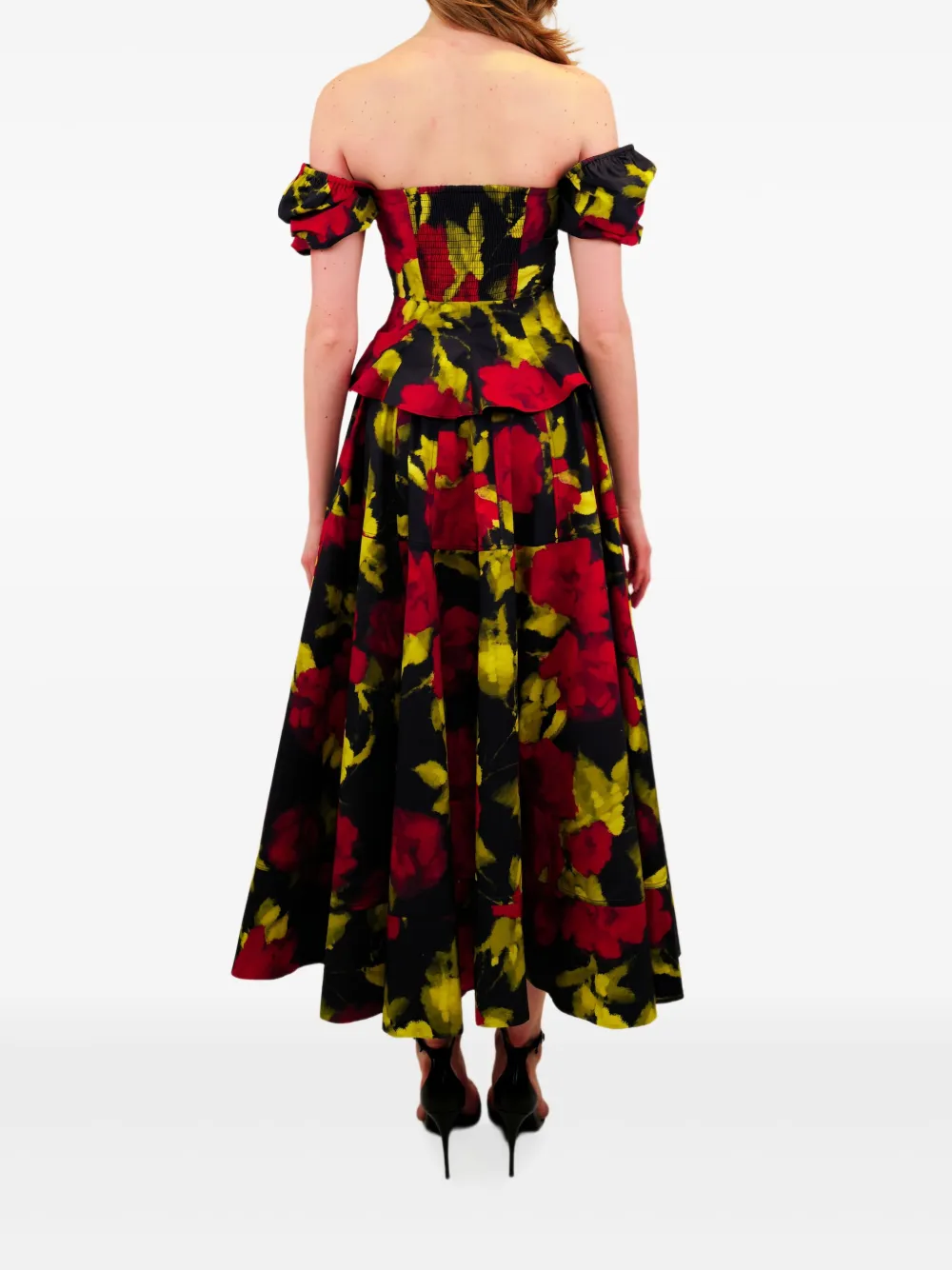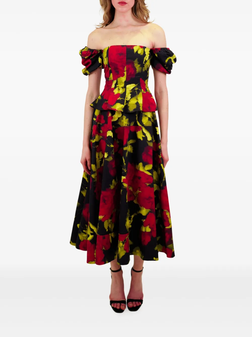 Черный с цветочным принтом открытые плечи короткие рукава баска по низу многоярусный дизайн
