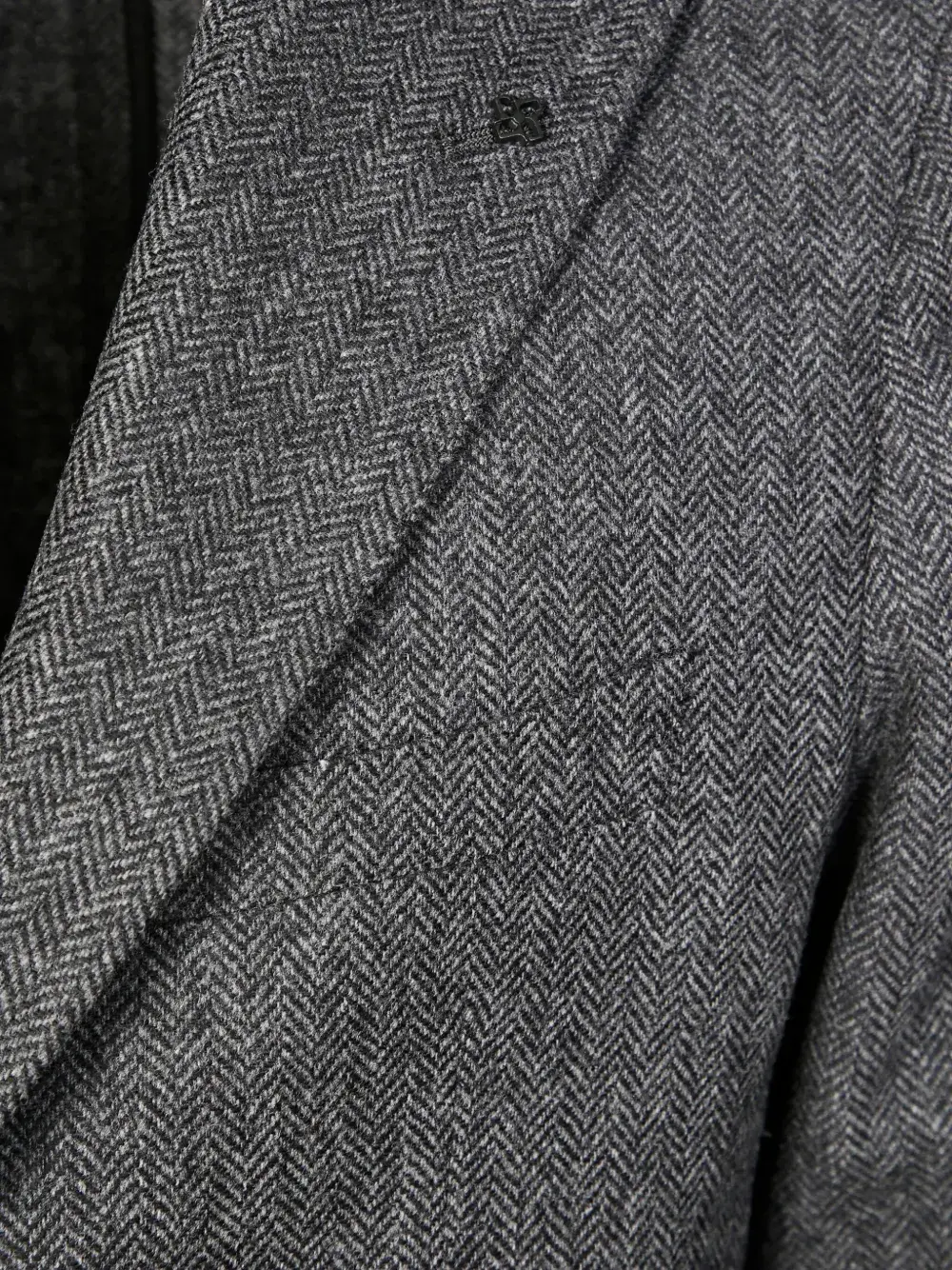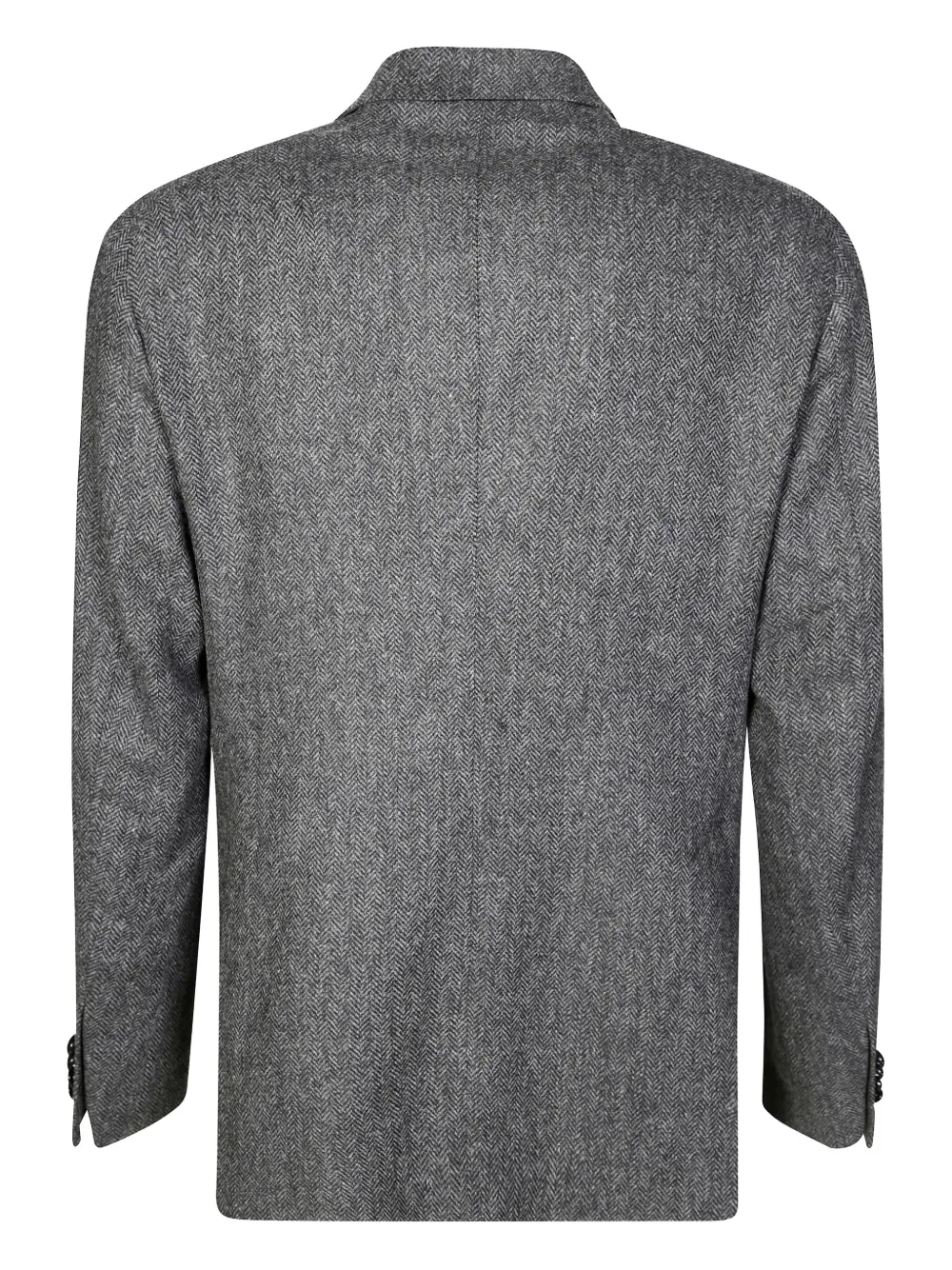 Серый узор «елочка», застежка на пуговицы, лацканы с острыми концами, накладные карманы спереди, манжеты на пуговицах