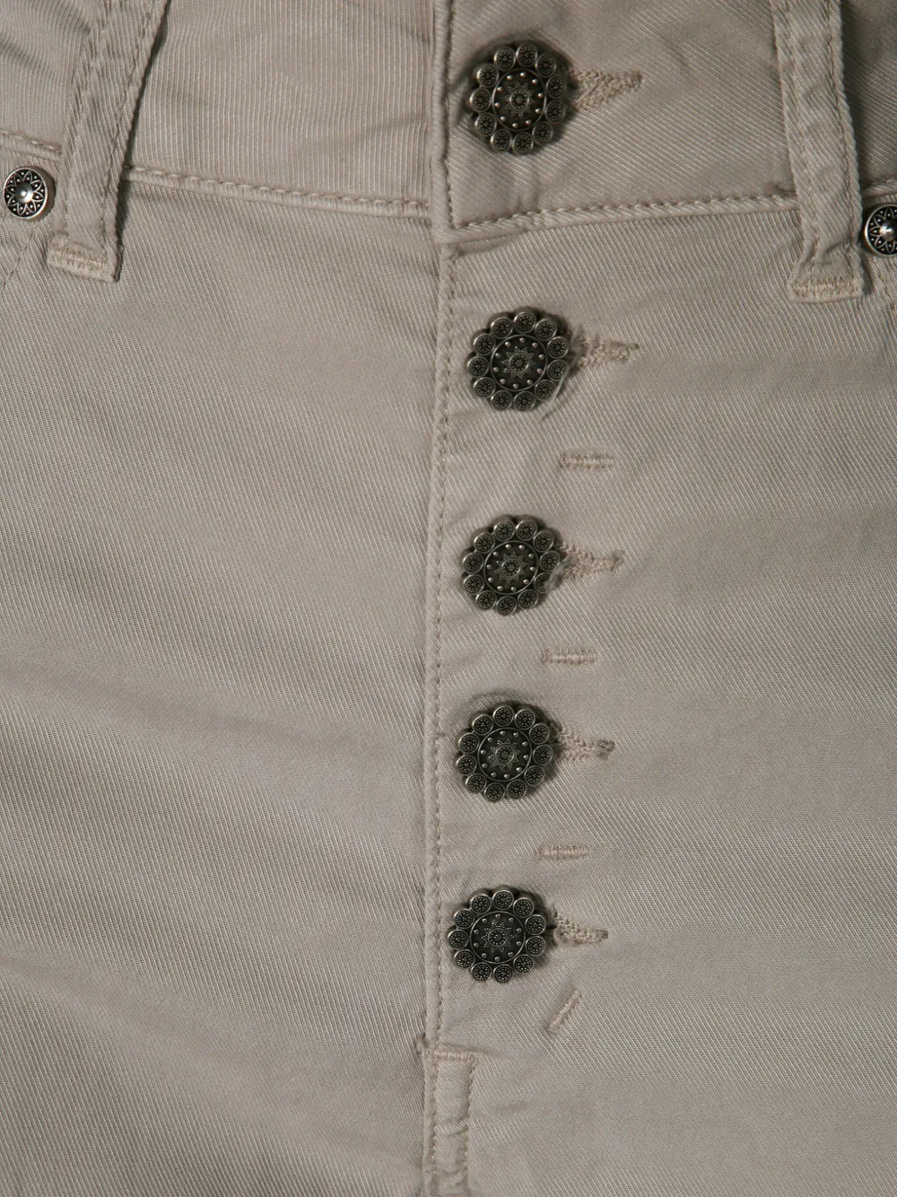 Светло-серый цвет, застегивается на пуговицы, манжеты с отворотами, шлевки для ремня, пять карманов