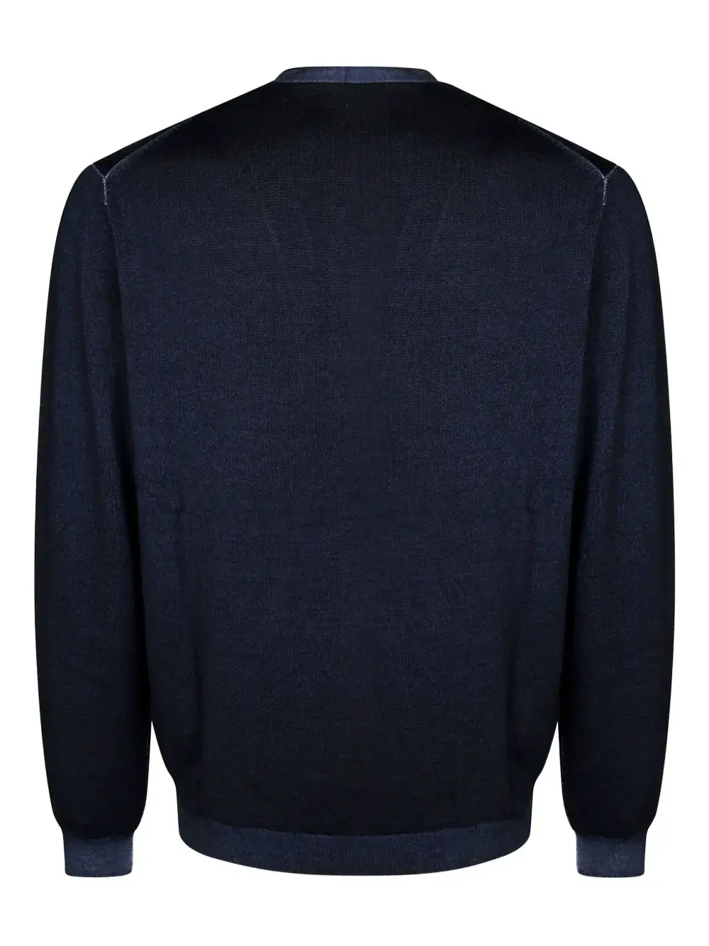 Темно-синий, застежка на пуговицы, V-образный вырез, длинные рукава, вышитый логотип