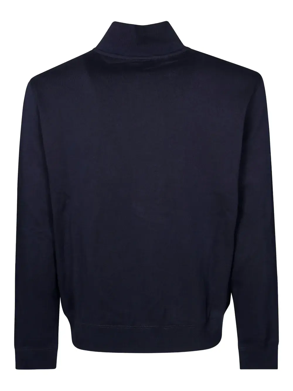 Темно-синий цвет, вышитые детали, застежка на пуговицы, высокий воротник, рубчатые край и манжеты