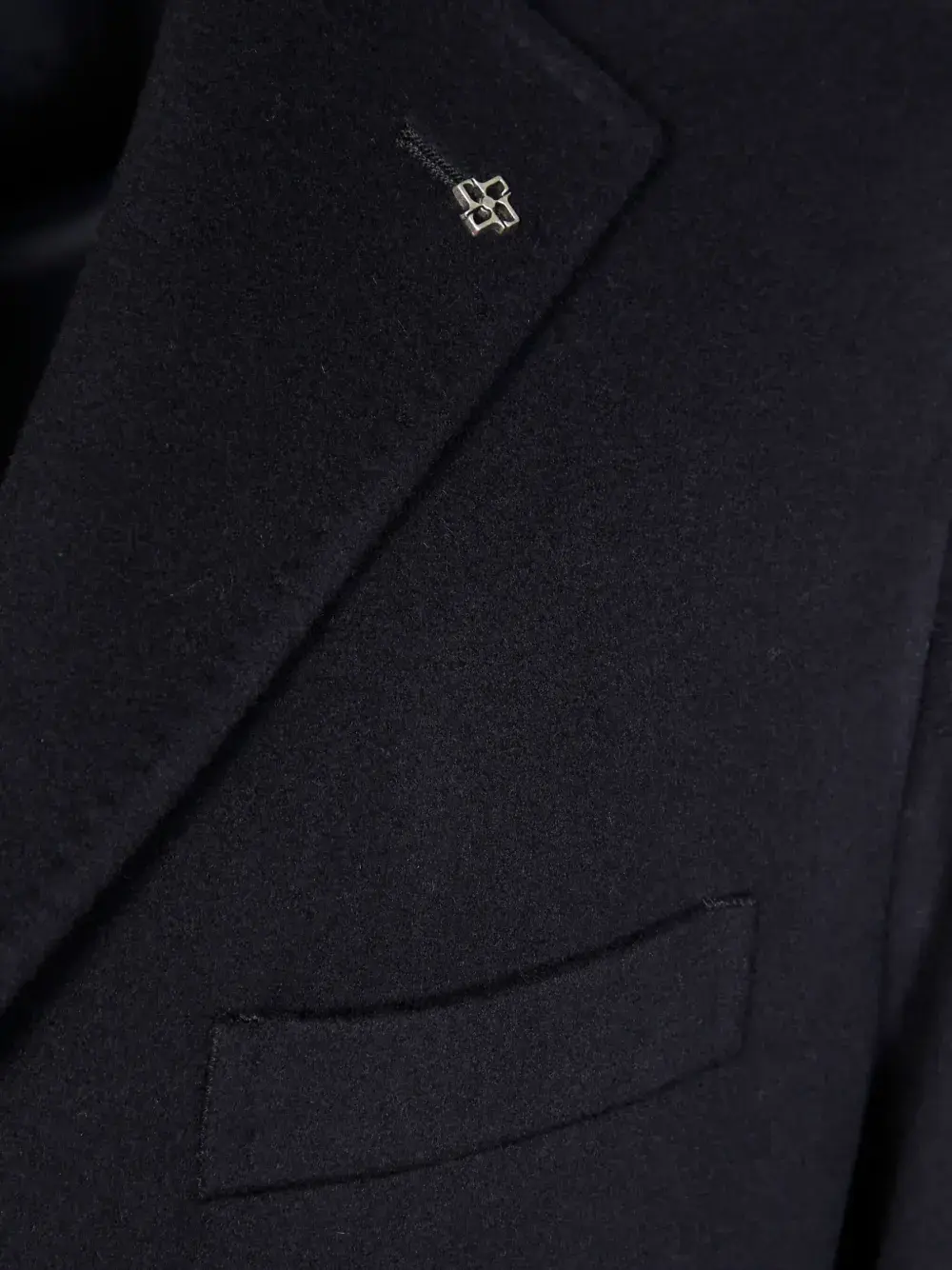 Темно-синий, застегивающийся на пуговицы, лацканы с выемкой, нагрудный прорезной карман, длинные рукава