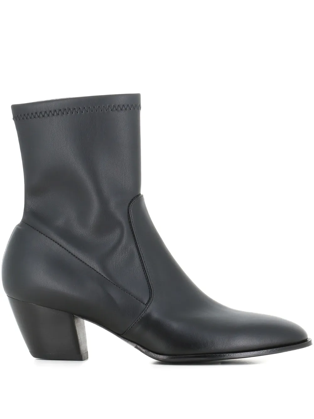 Черные ботильоны на толстом каблуке с заостренным носком, кожаным верхом и дизайном без застежек, длина до лодыжки