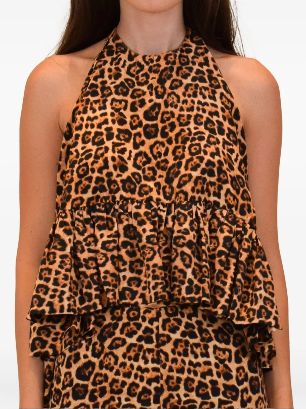 Леопардовый принт, воротник-хальтер, открытая спина, завязки, многослойные оборки