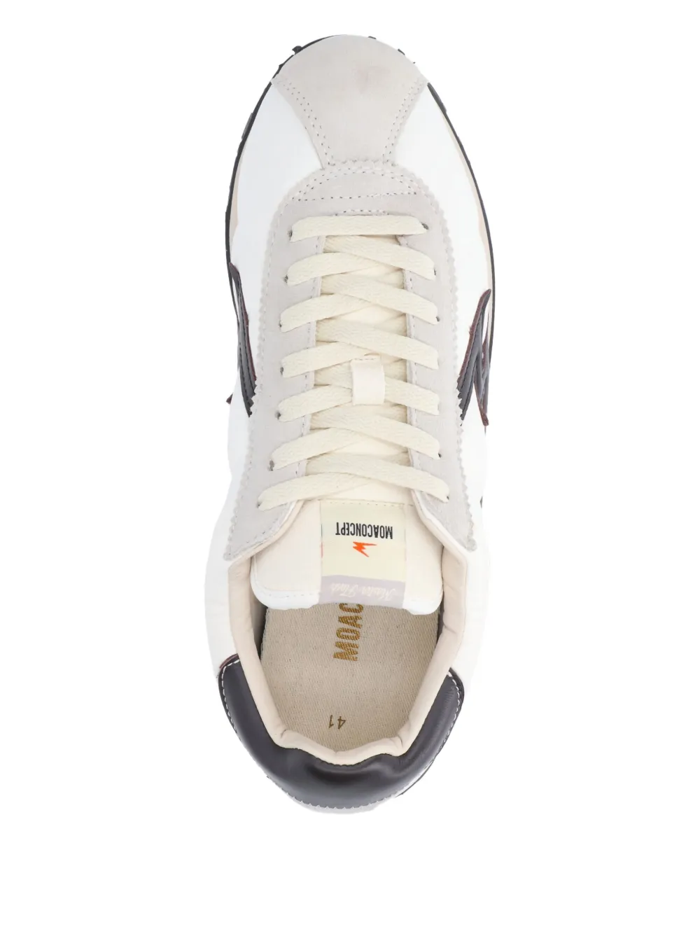 Белый цвет, контрастные вставки, шнуровка, круглый носок, плоская подошва, логотип