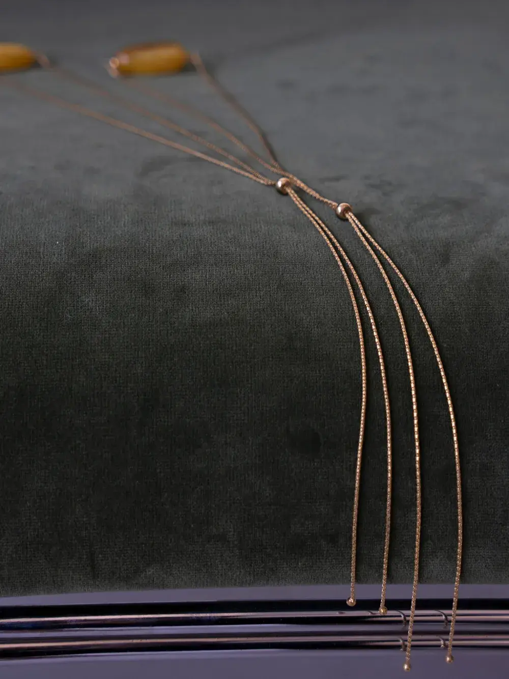 Цепочка с кулоном из камня золотистого оттенка, регулируемая застежка-скользящий механизм. При обычном ежедневном использовании и воздействии внешних факторов блеск драгоценных камней и золотых поверхностей может уменьшаться. Для ухода используйте специальные неабразивные средства, предназначенные для чистки украшений.