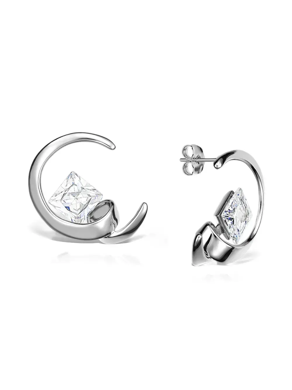 Серебристый оттенок, квадратная деталь, застежка-гвоздик, дугообразная форма. Эти серьги продаются парой.