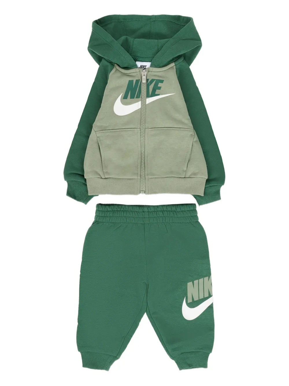 Зеленый комплект с логотипом включает футболку, худи и брюки; застежка-молния на капюшоне, короткие рукава
