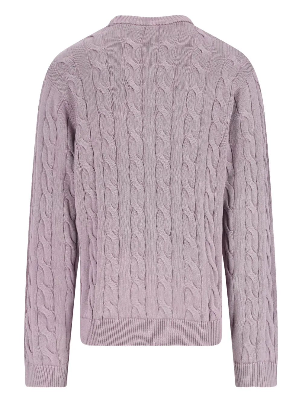 Розовый вязаный узор "косы", ребристый край, ребристые манжеты, круглый вырез, вышитый логотип