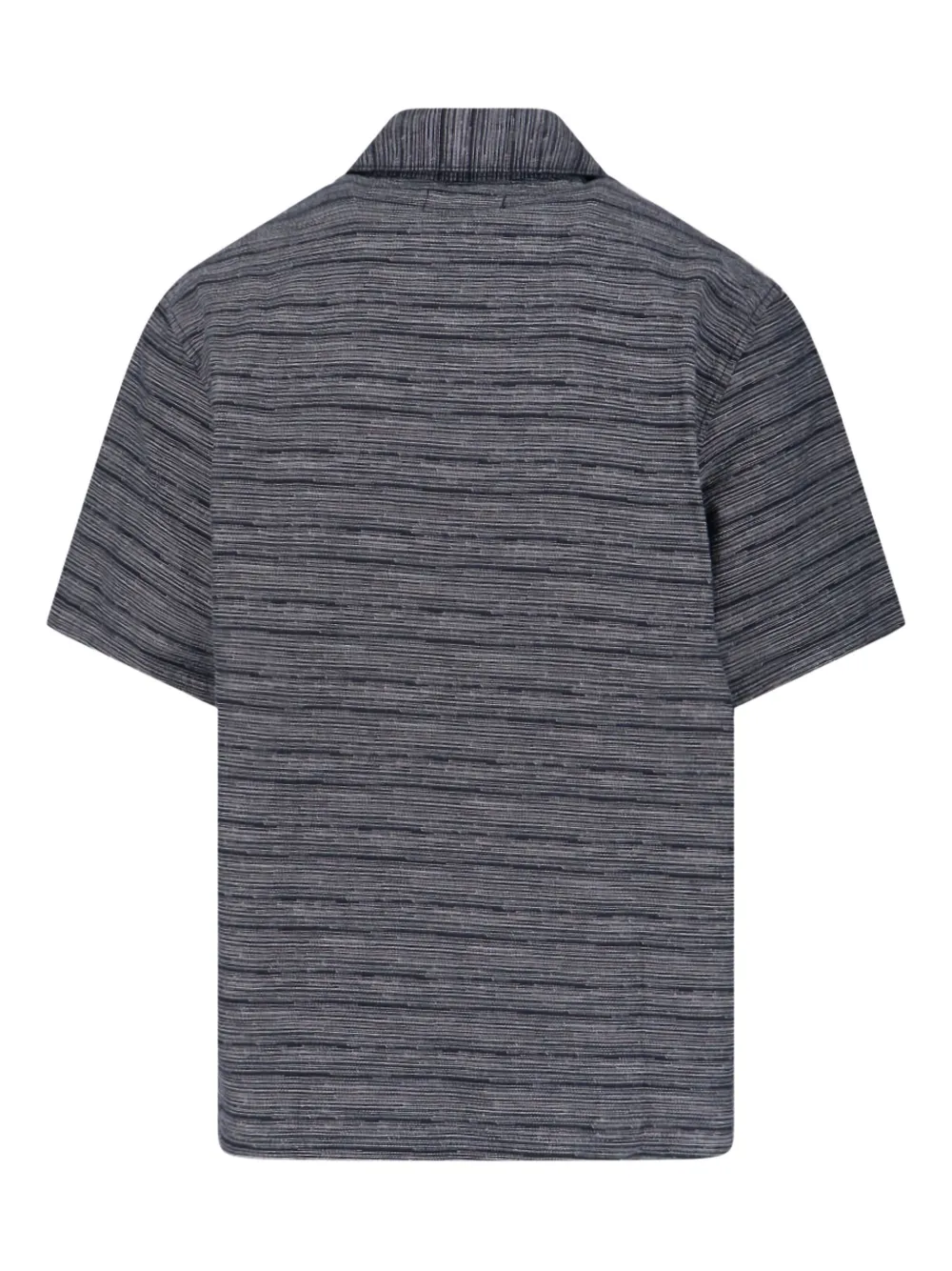 Серо-полосатая рубашка с короткими рукавами, нагрудным карманом, застежкой на пуговицы и нашивкой с логотипом