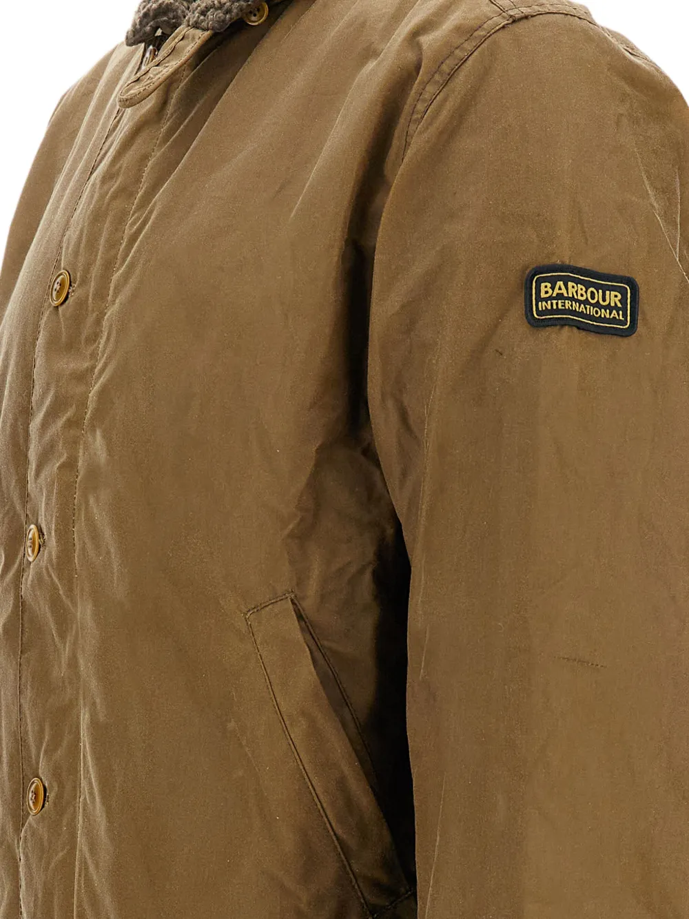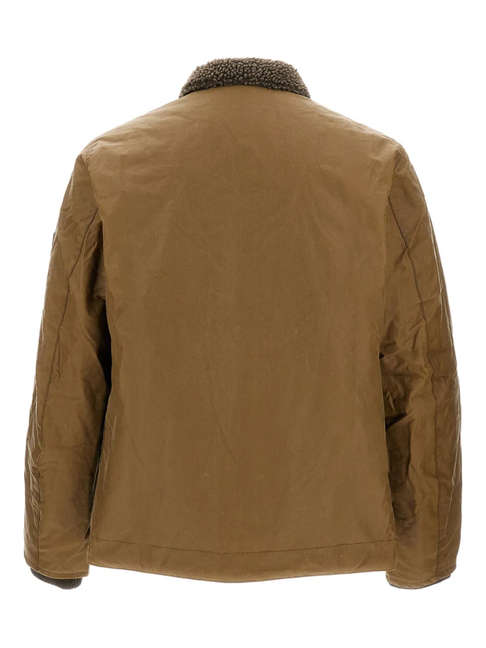 Темно-коричневая вощеная отделка, нашивка с логотипом на рукаве, застежка на молнию и пуговицы