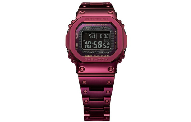 DW-5000C — это оригинальная модель G-Shock 1983 года. Серия GMW-B5000 унаследовала её характерный квадратный дизайн, получила цельнометаллическое исполнение и ряд усовершенствованных функций, включая связь со смартфоном. Полностью металлический корпус часов создан с использованием ударопрочного амортизирующего материала из высококачественной смолы, который размещен между корпусом и прочным безелем из нержавеющей стали. Благодаря технологии высокой плотности компоновки удалось сохранить компактные размеры модели. Задняя крышка часов выполнена по надежной технологии винтового замка (Screw Lock Back) и покрыта износостойким DLC-покрытием. Для создания фирменного элегантного образа на весь корпус и браслет нанесено бордовое ионное покрытие. Читаемость дисплея также была улучшена за счет использования пленочного солнечного элемента и дисплея типа STN-LCD.
