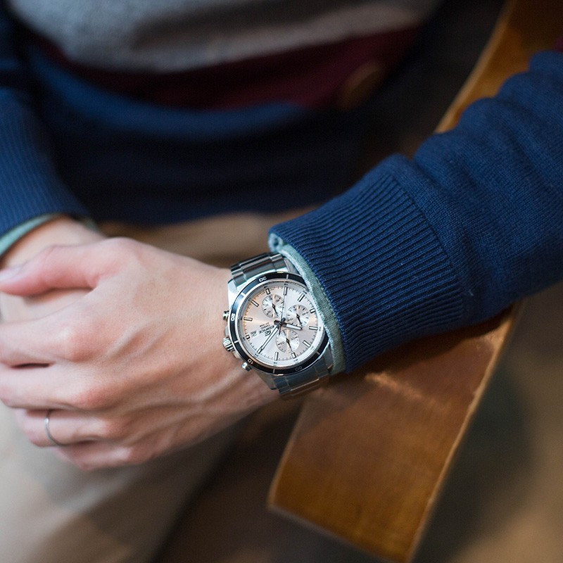Повысьте свой стиль с классическим хронографом EDIFICE, который отличается корпусом среднего размера и тщательно проработанным дизайном. Прочный браслет из нержавеющей стали сочетается с безелем и циферблатом в изысканном оттенке, создавая стильный образ, излучающий тепло.