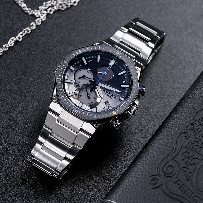 Коллаборация второй половины 2020 года в коллекции Edifice и итальянской гоночной команды Формулы-1 Scuderia AlphaTauri из свежей серии EQB-1100 в стальном корпусе с градиентным циферблатом в цветах болида команды и карбоновым безелем! Особенность модели — невероятно тонкий, по сравнению с другими часами эдифис, корпус толщиной всего в 8.9 мм. В часах используется новый модуль, оснащенный Bluetooth, благодаря чему, часы могут автоматически подключаться к вашему смартфону для синхронизации точного времени, удобной настройки или для быстрого поиска телефона, если он как обычно куда-то пропал (смартфон начнет издавать звуковые сигналы, при нажатии на специальную кнопку на часах). Отличный лимитированный релиз, который понравится всем поклонникам гоночного спорта и просто любителям стильных часов.