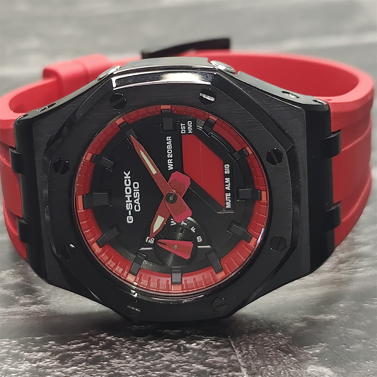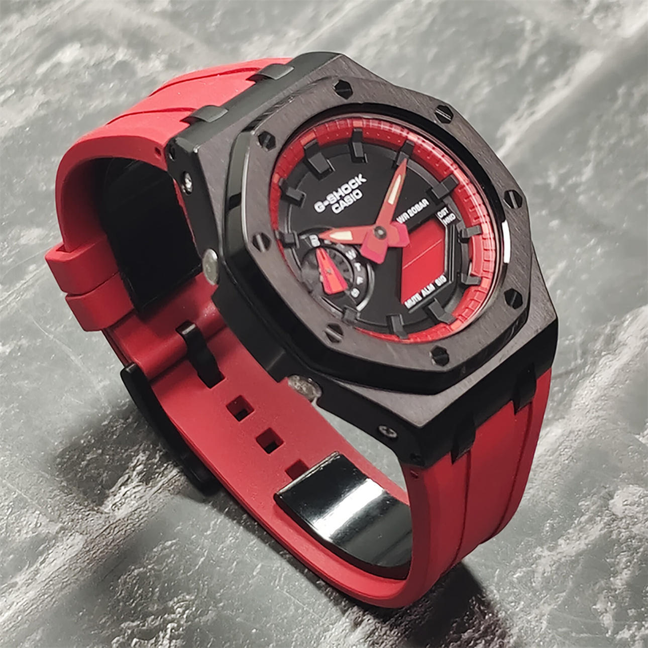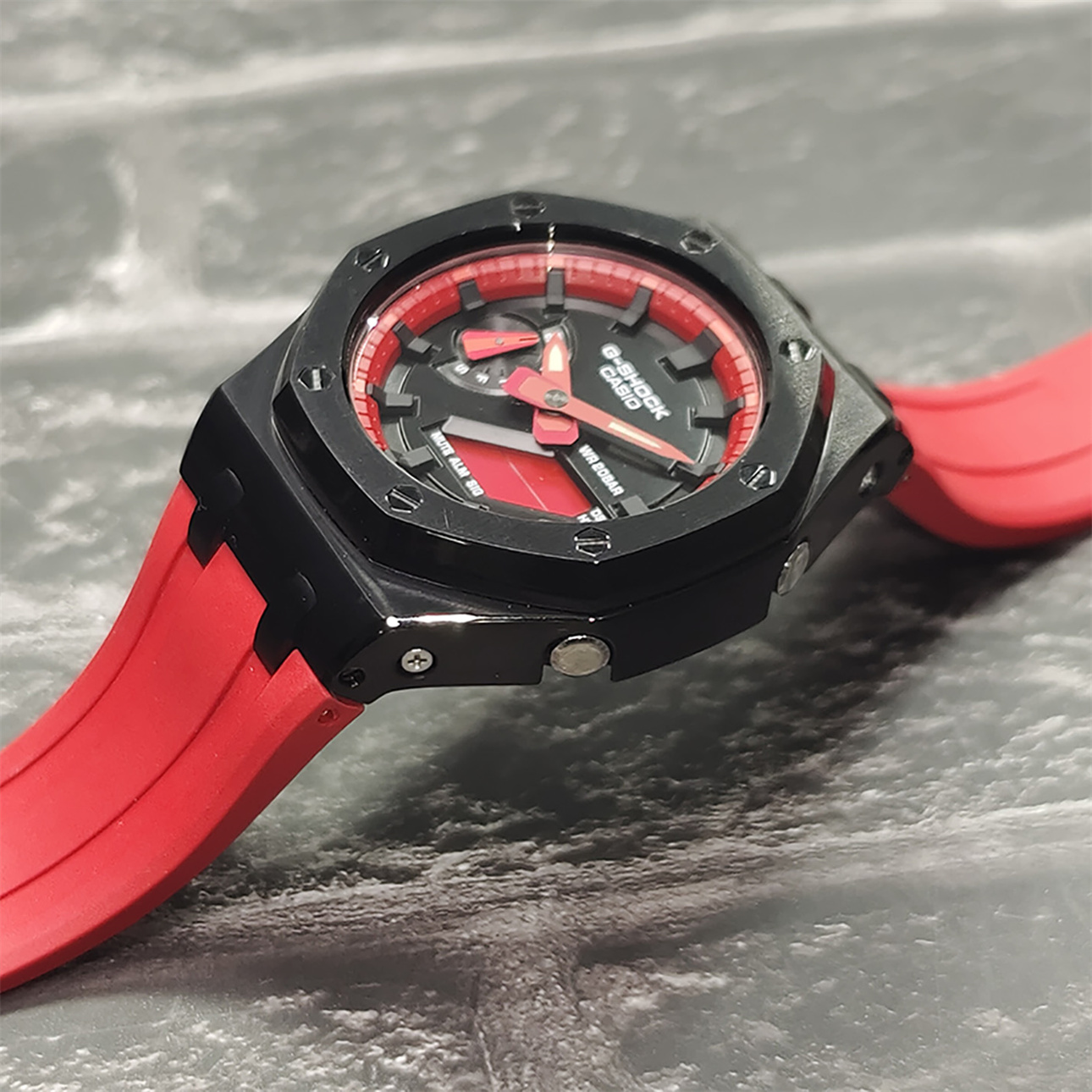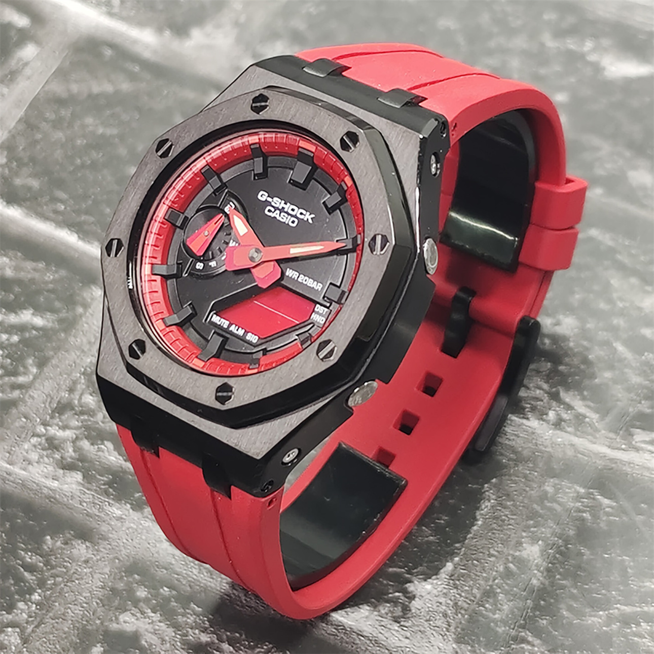 От G-SHOCK — часов прочности, которые продолжают эволюционировать в поисках абсолютной надежности, — эта модель использует структуру Carbon Core Guard. Корпус изготовлен из мелкозернистой смолы, содержащей углеродное волокно, которая, оставаясь легкой, превосходит по жесткости обычную смолу. Это предотвращает повреждения и деформации от ударов, защищая внутренний модуль. Кроме того, двухслойная структура задней крышки также обеспечивает защиту от воздействий на тыльную сторону часов. Ударопрочная конструкция кнопок позволила создать дизайн без традиционных защитных кожухов вокруг них. В дизайне выделяются трехмерный циферблат и смелое расположение крупных фронтальных кнопок. Модель выполнена в брутальном стиле, создающем мощный и выразительный образ.