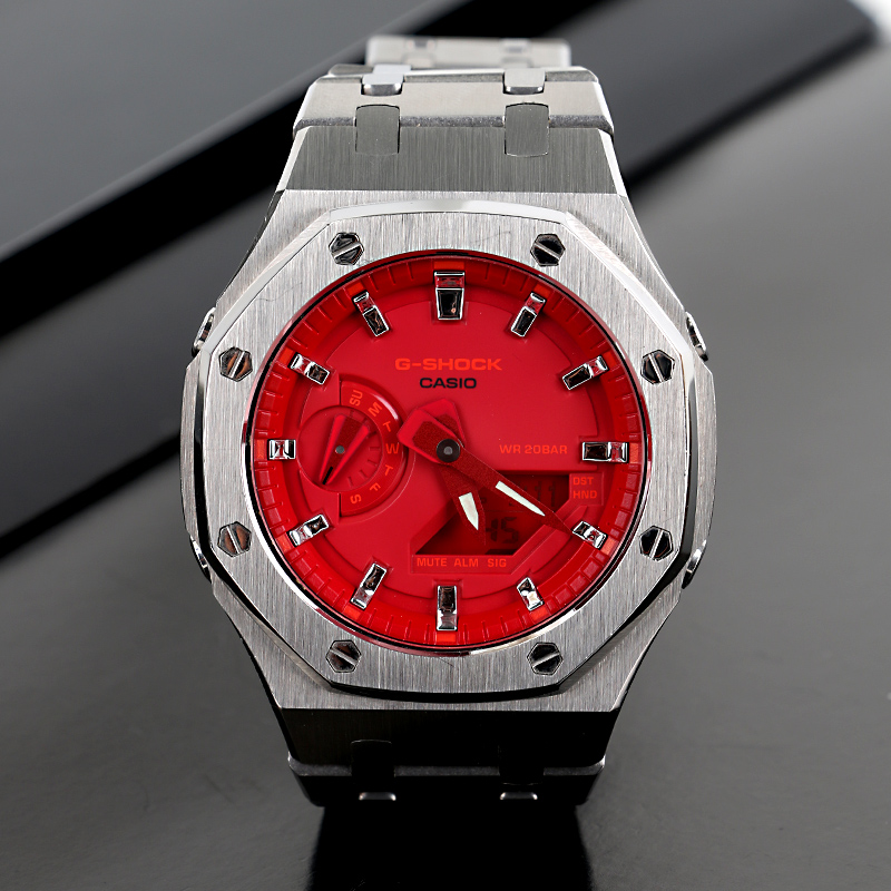 От G-SHOCK — часов прочности, которые продолжают эволюционировать в поисках абсолютной надежности, — эта модель использует структуру Carbon Core Guard. Корпус изготовлен из мелкозернистой смолы, содержащей углеродное волокно, которая, оставаясь легкой, превосходит по жесткости обычную смолу. Это предотвращает повреждения и деформации от ударов, защищая внутренний модуль. Кроме того, двухслойная структура задней крышки также обеспечивает защиту от воздействий на тыльную сторону часов. Ударопрочная конструкция кнопок позволила создать дизайн без традиционных защитных кожухов вокруг них. В дизайне выделяются трехмерный циферблат и смелое расположение крупных фронтальных кнопок. Модель выполнена в брутальном стиле, создающем мощный и выразительный образ.