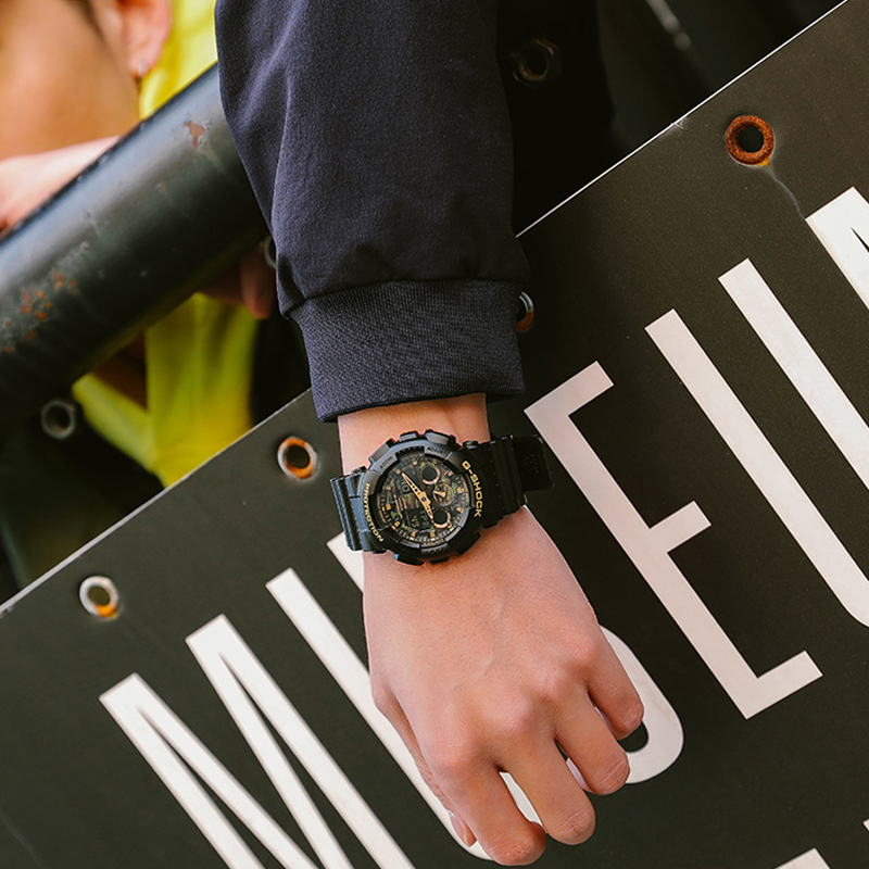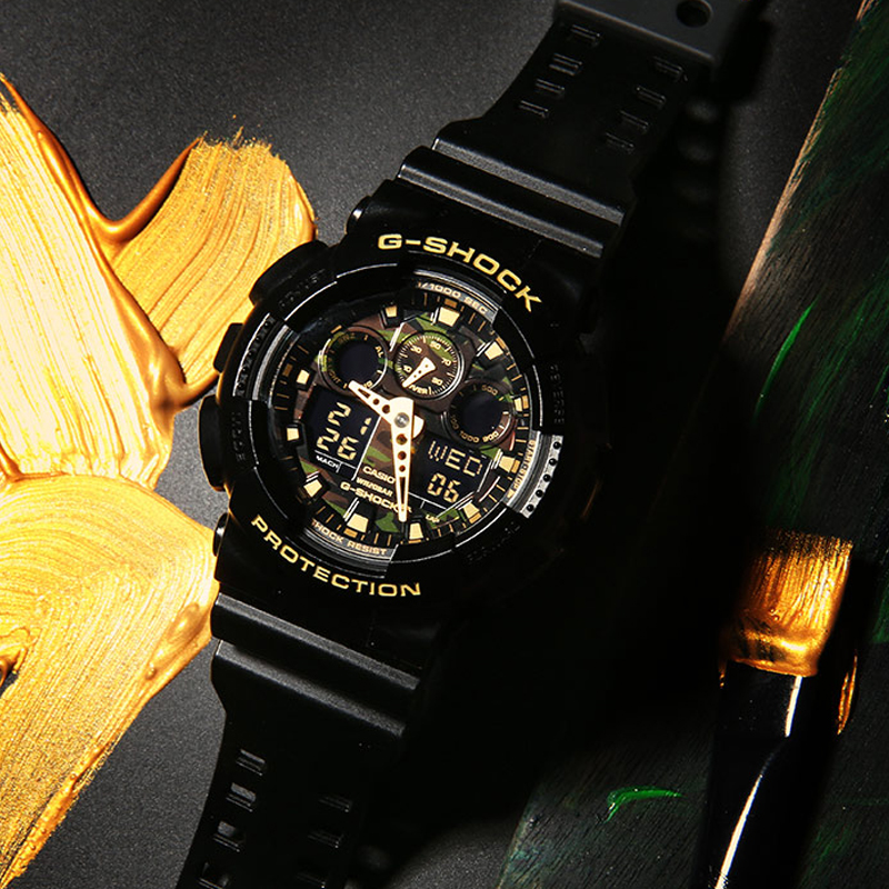 Набор часов из серии G-SHOCK и Baby-G. Модель из серии G-SHOCK с камуфляжным циферблатом, созданная для часов G-SHOCK, которые постоянно совершенствуются в стремлении к прочности, украшена камуфляжным узором, который становится всё более популярным в дизайне модных брендов. В качестве базовой модели использована модель GA-100, известная своим крупным, впечатляющим корпусом.