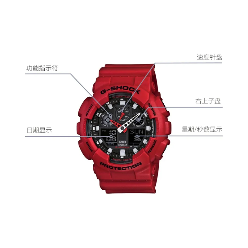 Модель сочетает аналоговую и цифровую индикацию, ценится за широкий циферблат. Корпус и ремешок с матовым покрытием выполнены в фирменных цветах G-SHOCK — чёрном и красном. Четыре ЖК-окна и спидометр симметрично расположены на циферблате, создавая строгий и чистый дизайн. Обладает отличной практичностью: включает секундомер с измерением миллисекунд, спидометр и защиту от магнитного воздействия по стандарту JIS 1-го класса. Прочная модель, которая ярко выделяется в уличной моде.