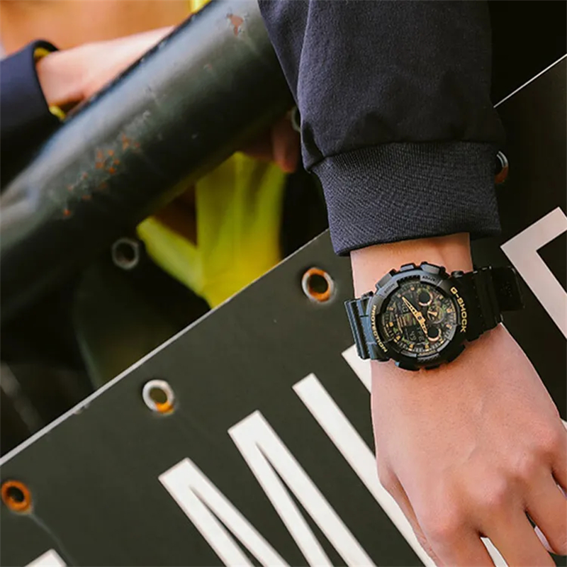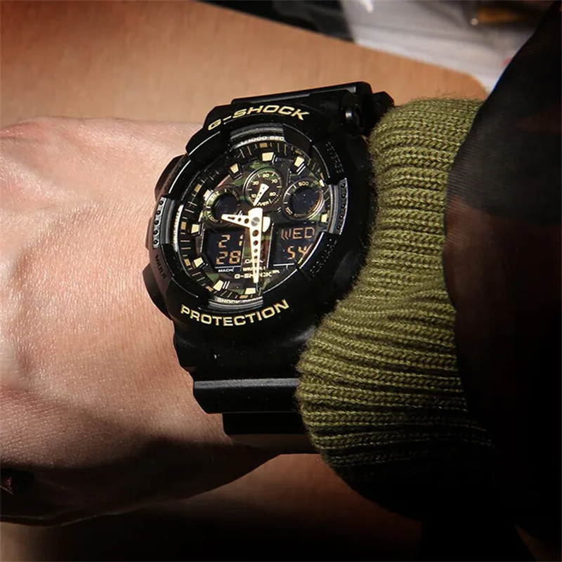 Эта модель из серии G-SHOCK с камуфляжным циферблатом, созданная для часов G-SHOCK, которые постоянно совершенствуются в стремлении к прочности, украшена камуфляжным узором, который становится всё более популярным в дизайне модных брендов. В качестве базовой модели использована модель GA-100, известная своим крупным, впечатляющим корпусом. Корпус и ремешок выполнены в чёрном базовом цвете в сочетании с эффектным металлическим камуфляжным циферблатом, что создаёт стильный вид и элегантную цветовую гамму. Эта серия с камуфляжным узором выражает прочность G-SHOCK через военный дизайн.
