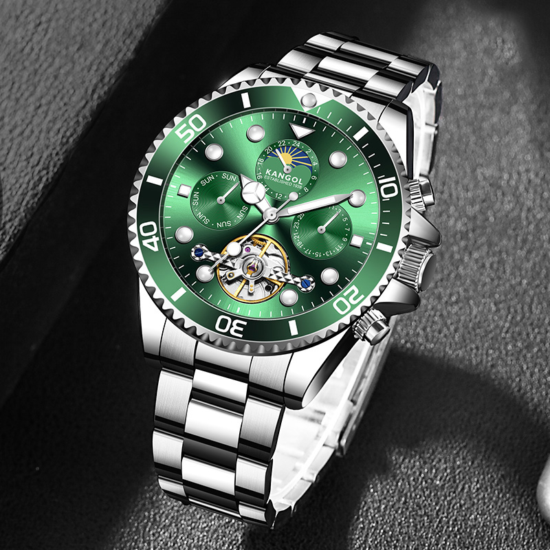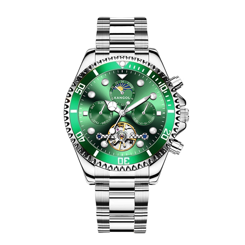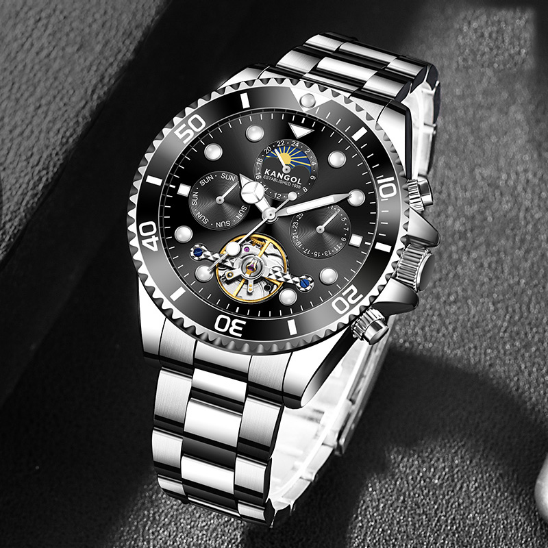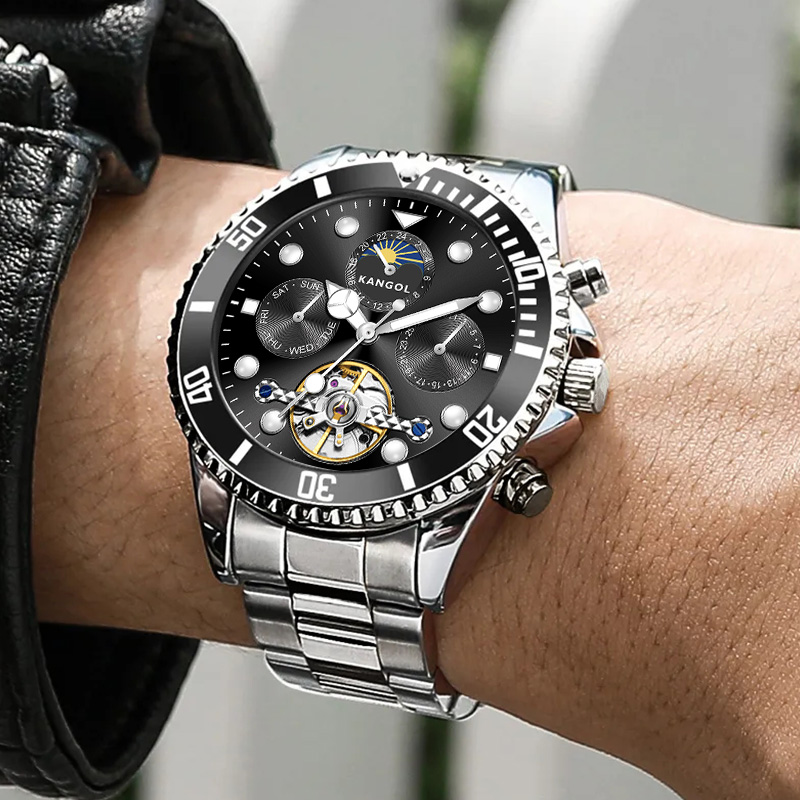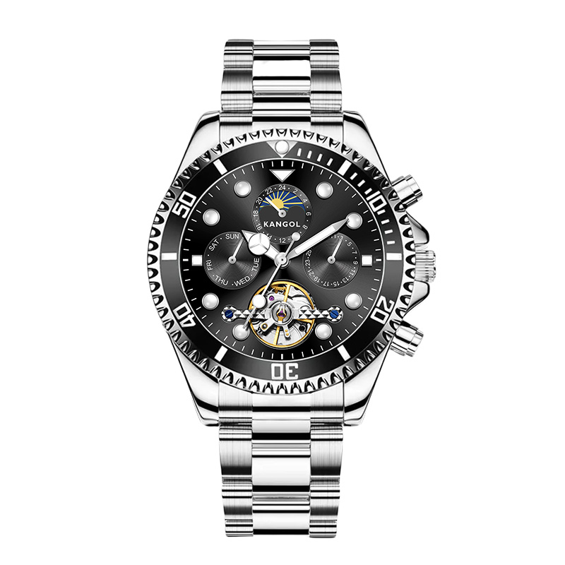KANGOL Часы Automatic Mechanical Movement Stainless Steel Strap Watch Men's Watch Black Dial, Silver Case Black Dial