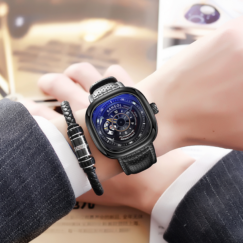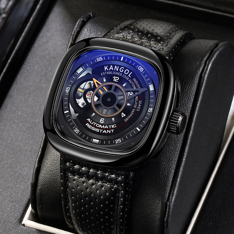 KANGOL Часы Black Friday Automatic Mechanical Movement Genuine Leather Strap Watch Men's Watch Cut-Out Dial