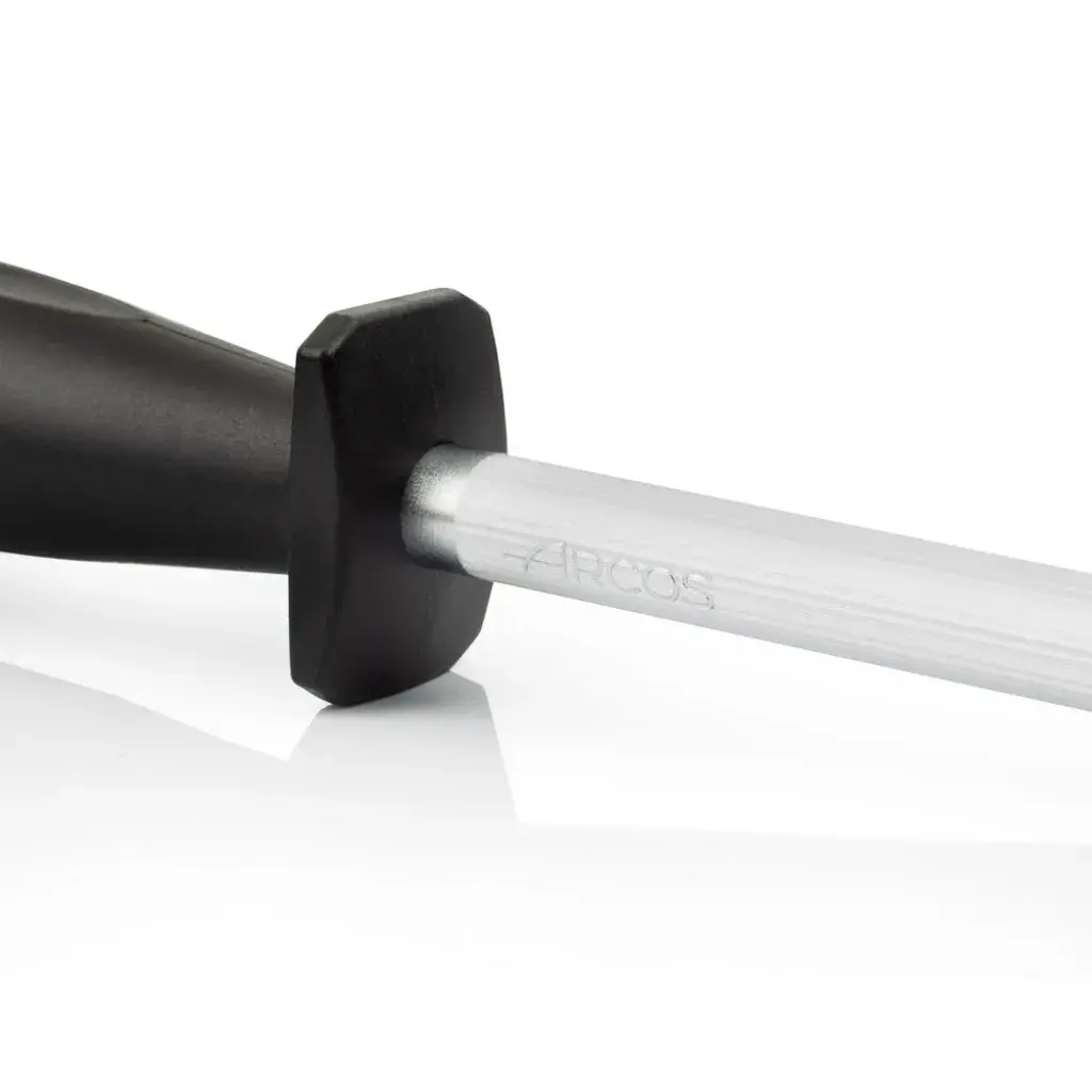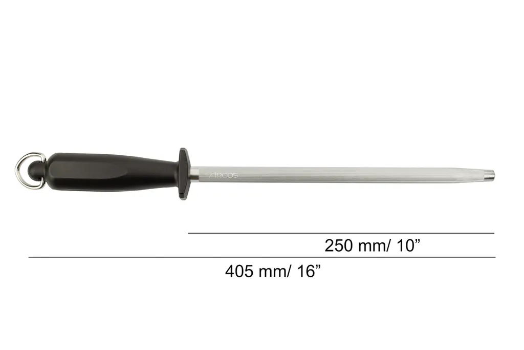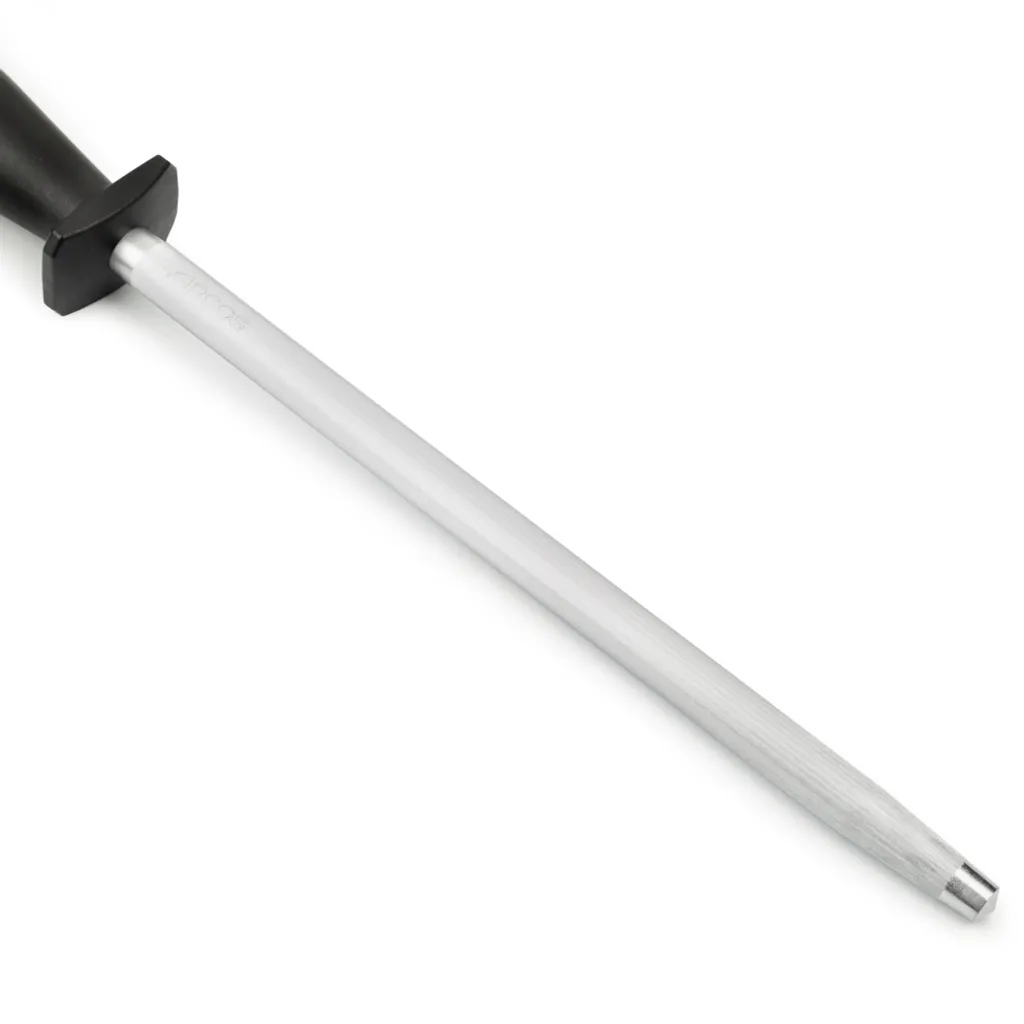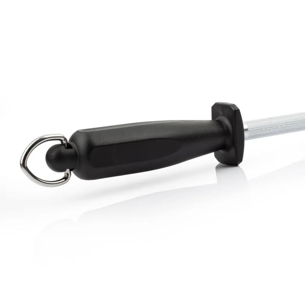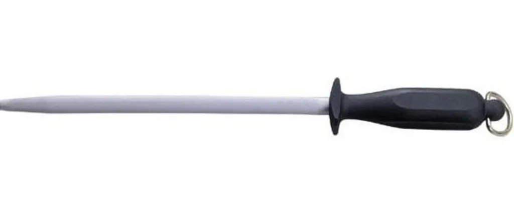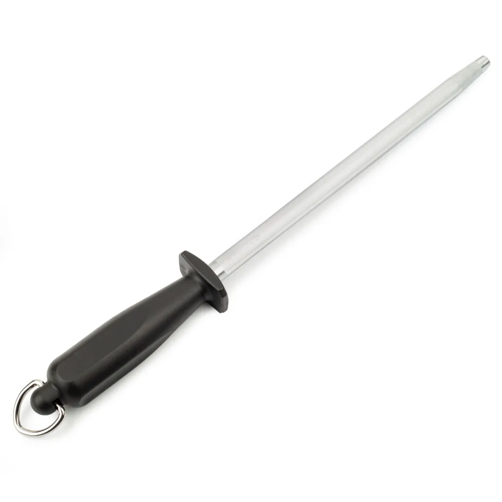 Профессиональная мусатка (точилка) длиной 25 см из углеродистой стали с рукоятью из полипропилена и защитным колпачком. Предназначена для заточки ножей. Эргономичная конструкция обеспечивает безопасное и удобное использование.