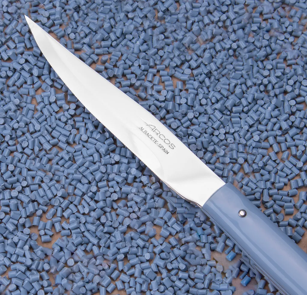 Рукоятка в форме ножа из синего полипропилена с 3 заклепками из нержавеющей стали, которые предотвращают отсоединение лезвия от ручки.