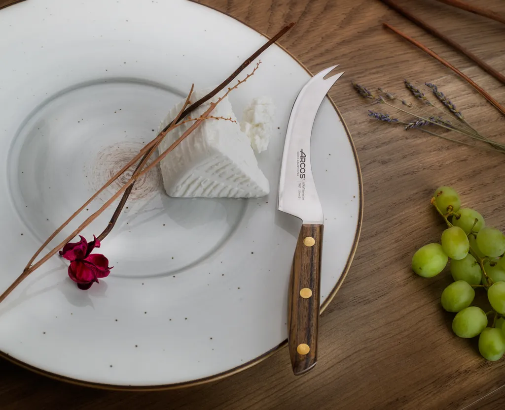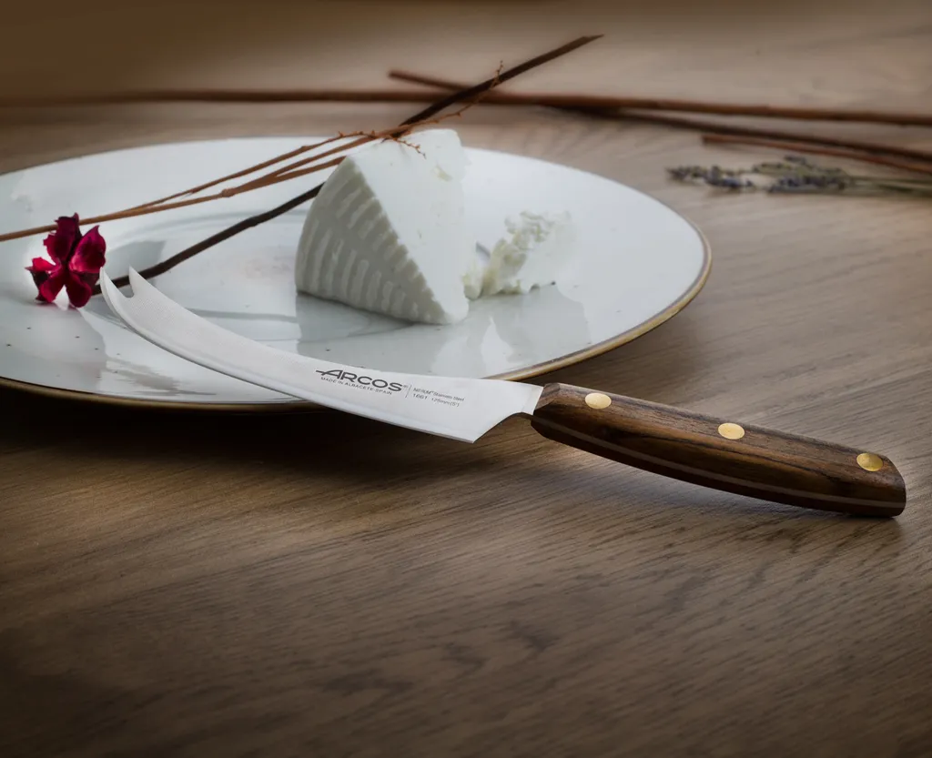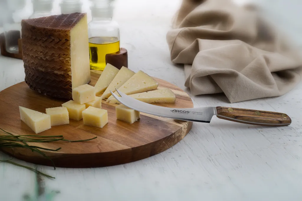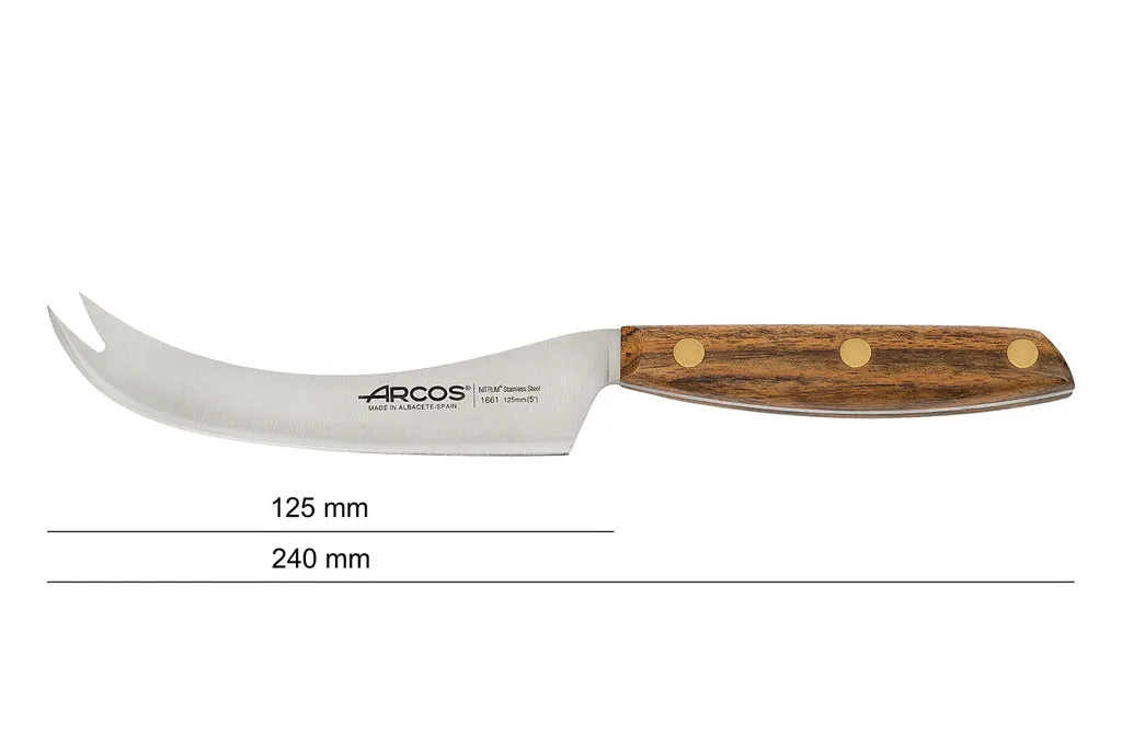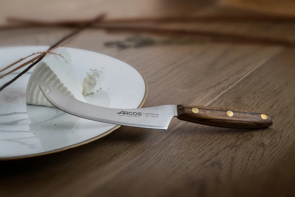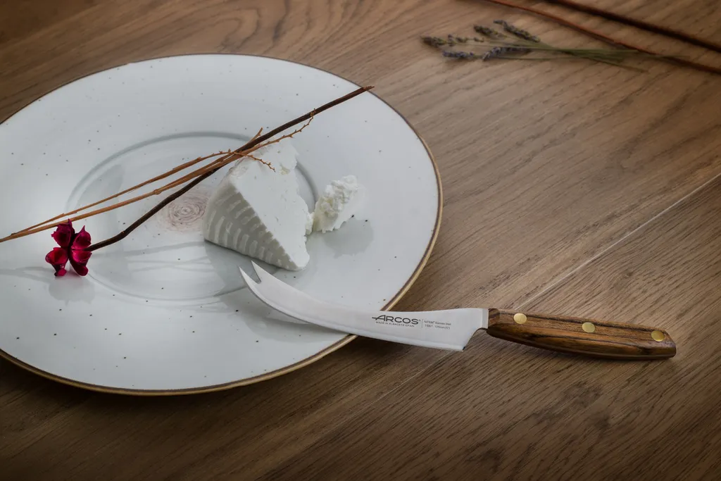 Специализированный нож для сыра из коллекции Nórdika с изогнутым лезвием 125 мм. Коричневая эргономичная рукоятка обеспечивает удобный захват, а заостренный кончик лезвия идеален для нарезки как мягких, так и твердых сортов сыра.