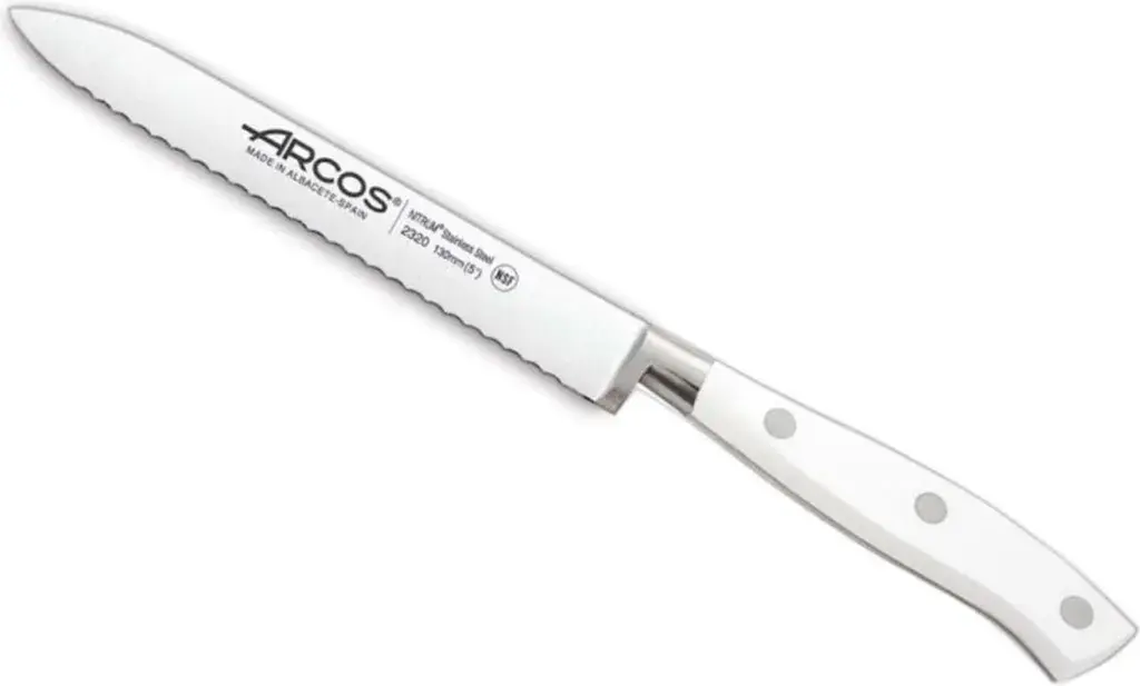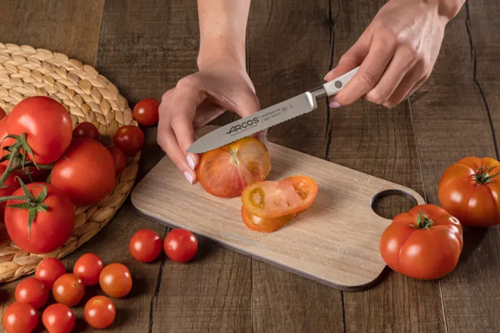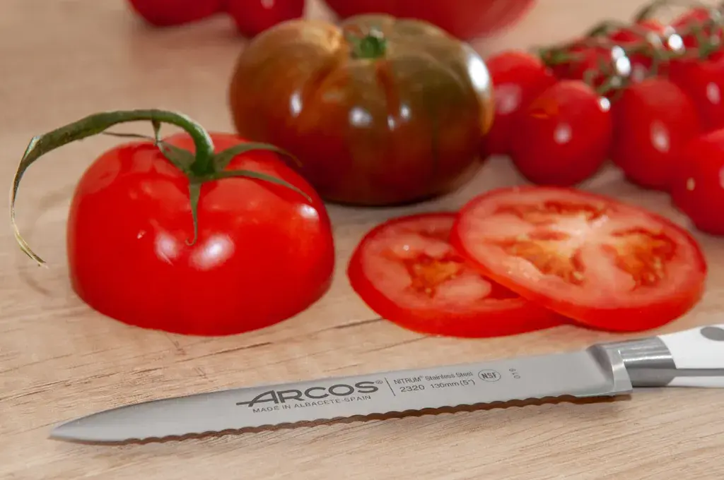 Специализированный нож для томатов с лезвием 13 см из нитро-стали и эргономичной белой рукояткой из полиоксиметилена. Зубчатое лезвие гарантирует аккуратную нарезку даже самых мягких и тонкокожих помидоров без деформации мякоти. Идеальный инструмент для работы с деликатными продуктами.