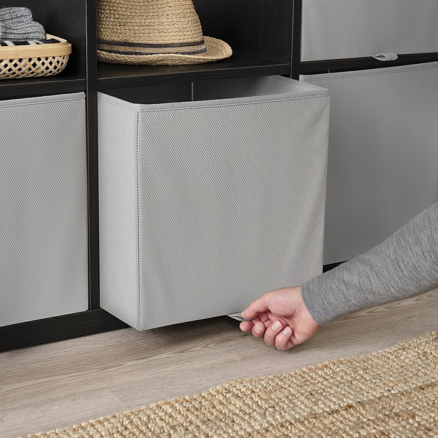 Этот контейнер для хранения так же легко собирается и складывается. Он отлично подходит для хранения громоздких вещей и подходит по размеру для стеллажа KALLAX.