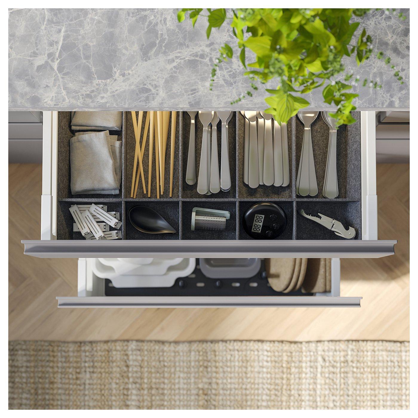 Для организации и эффективного использования пространства ящики MAXIMERA можно дополнить органайзерами VARIERA, такими как лоток для столовых приборов, лоток для кухонных принадлежностей или держатель для тарелок.